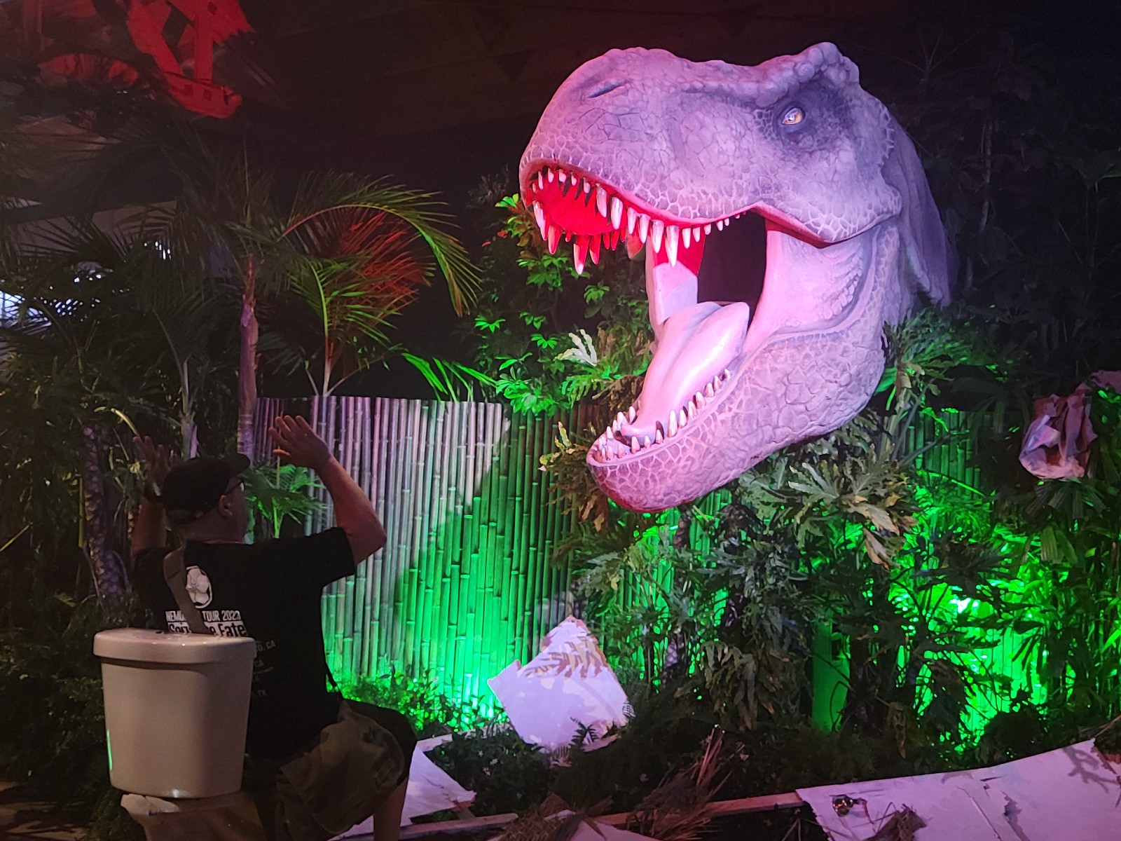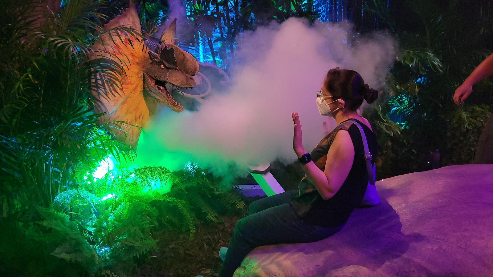 Moving on, we came to the Dilophosaurus, the dinosaur that killed Dennis Nedry in the movie! A staff member asked if a brave soul might want to sit on the rock and face the dinosaur, and Pablo immediately jumped at the chance. Soon after, a few other brave souls, including myself, also faced the Dilophosaurus as it sprayed its venom at us.