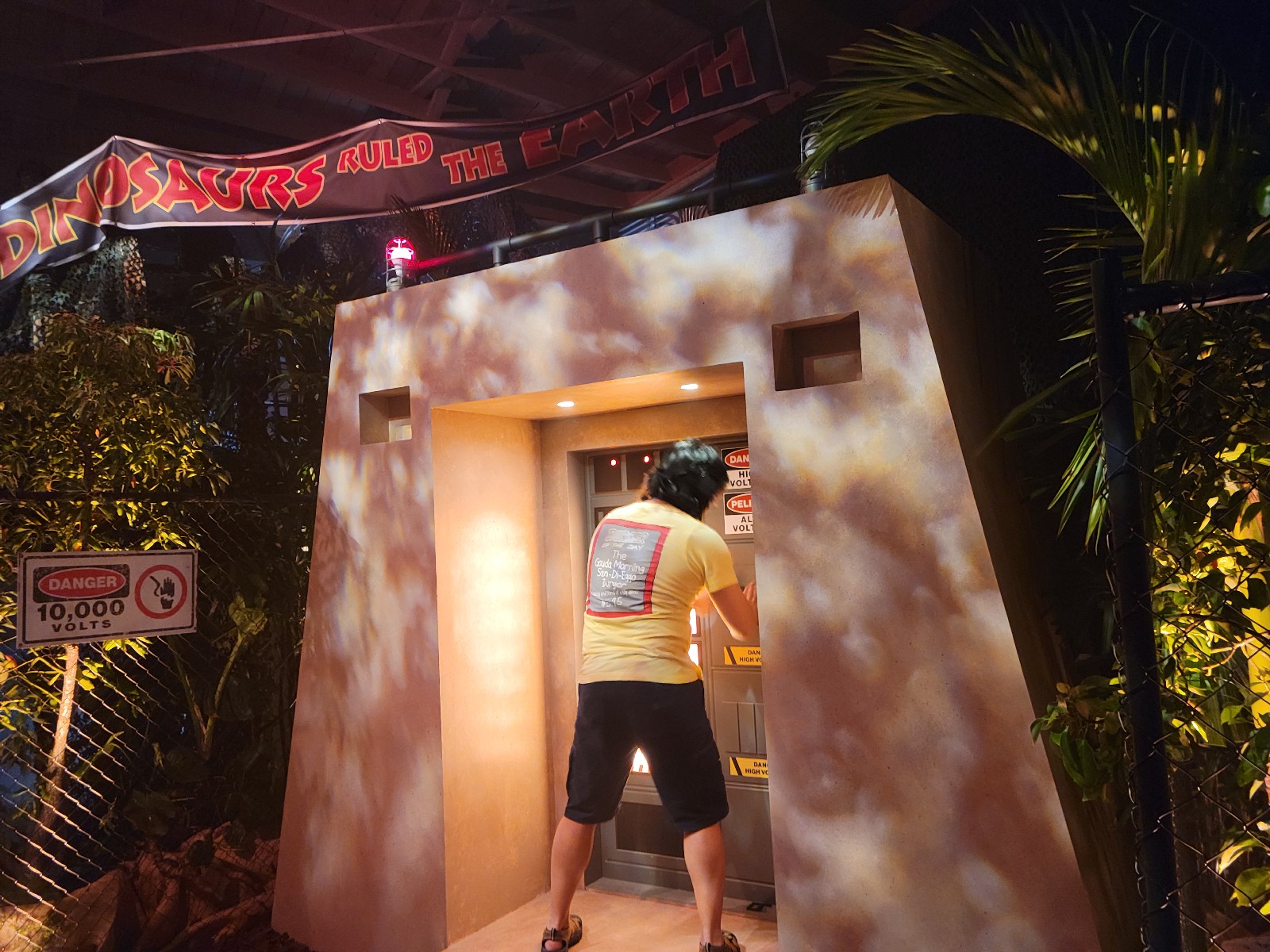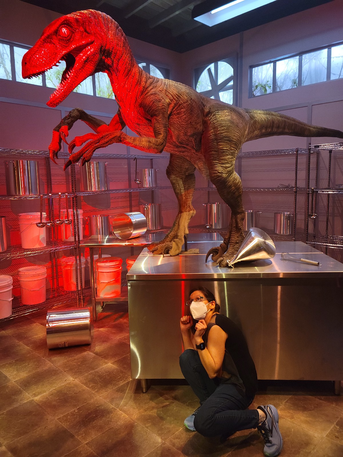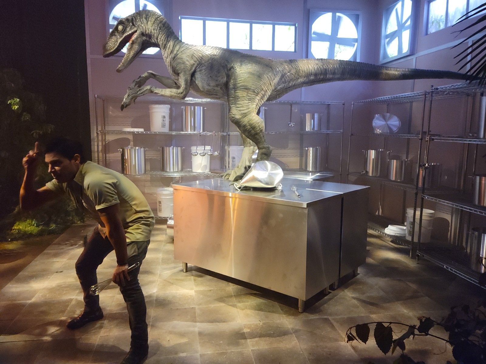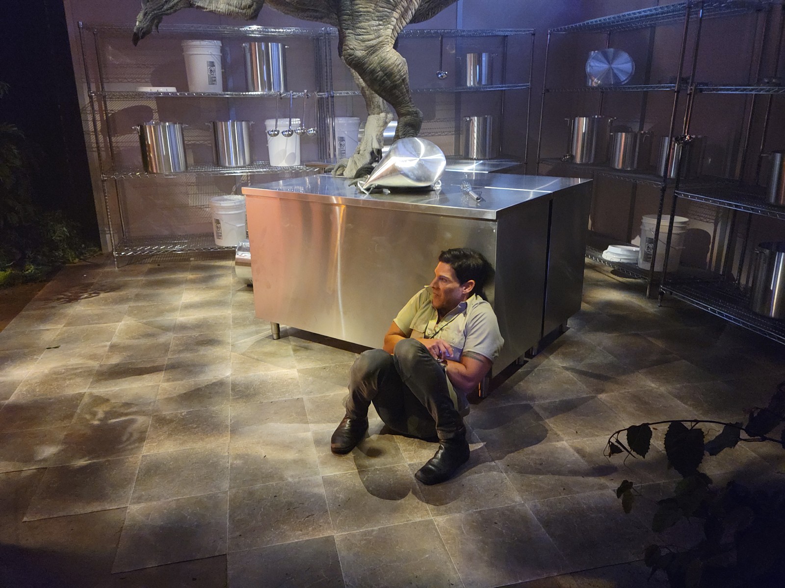 Of course, they couldn’t leave out the iconic Velociraptors kitchen scene. The staff member played into the role, hiding behind the cabinet, then we each got a chance to do the same.