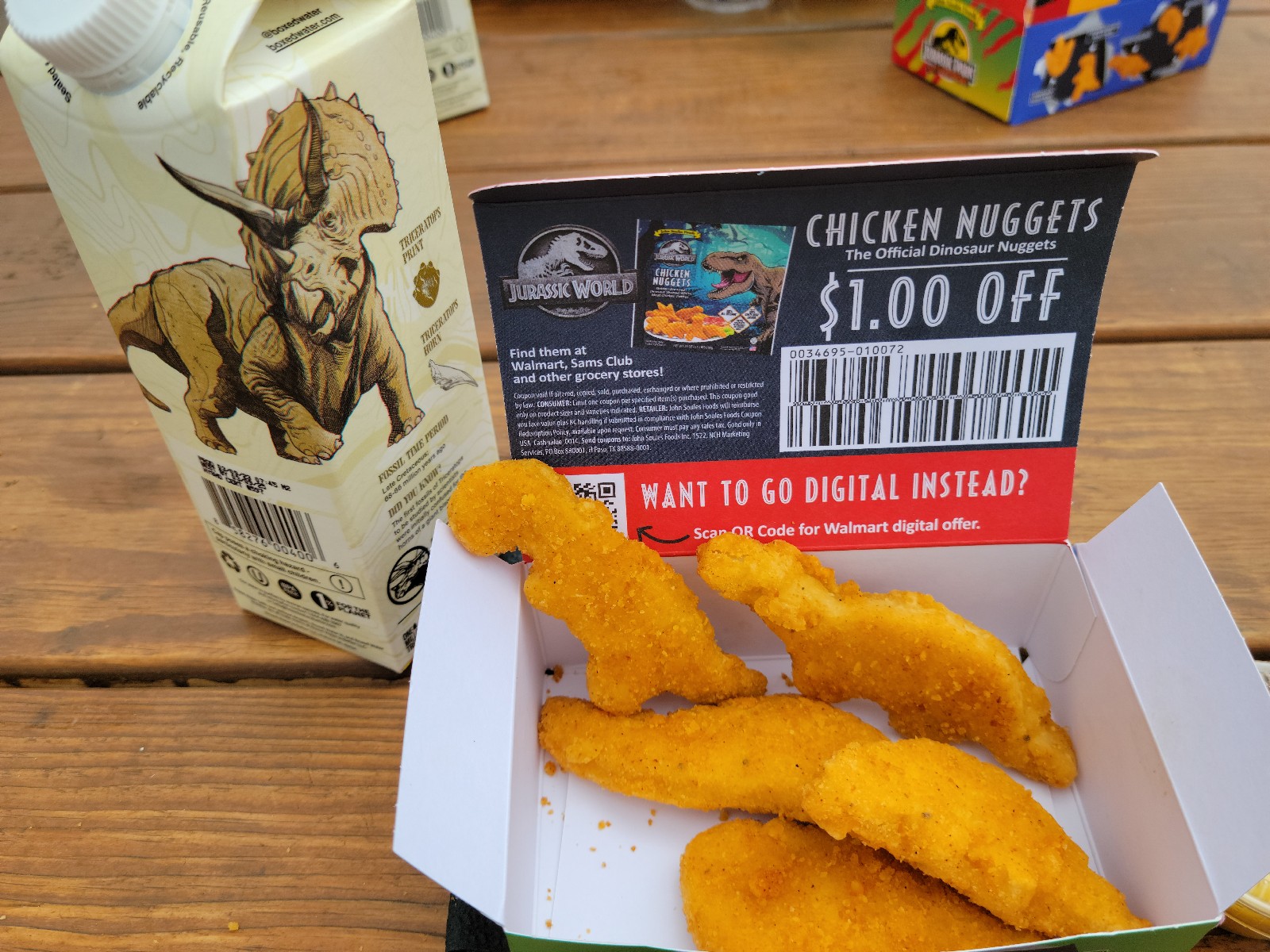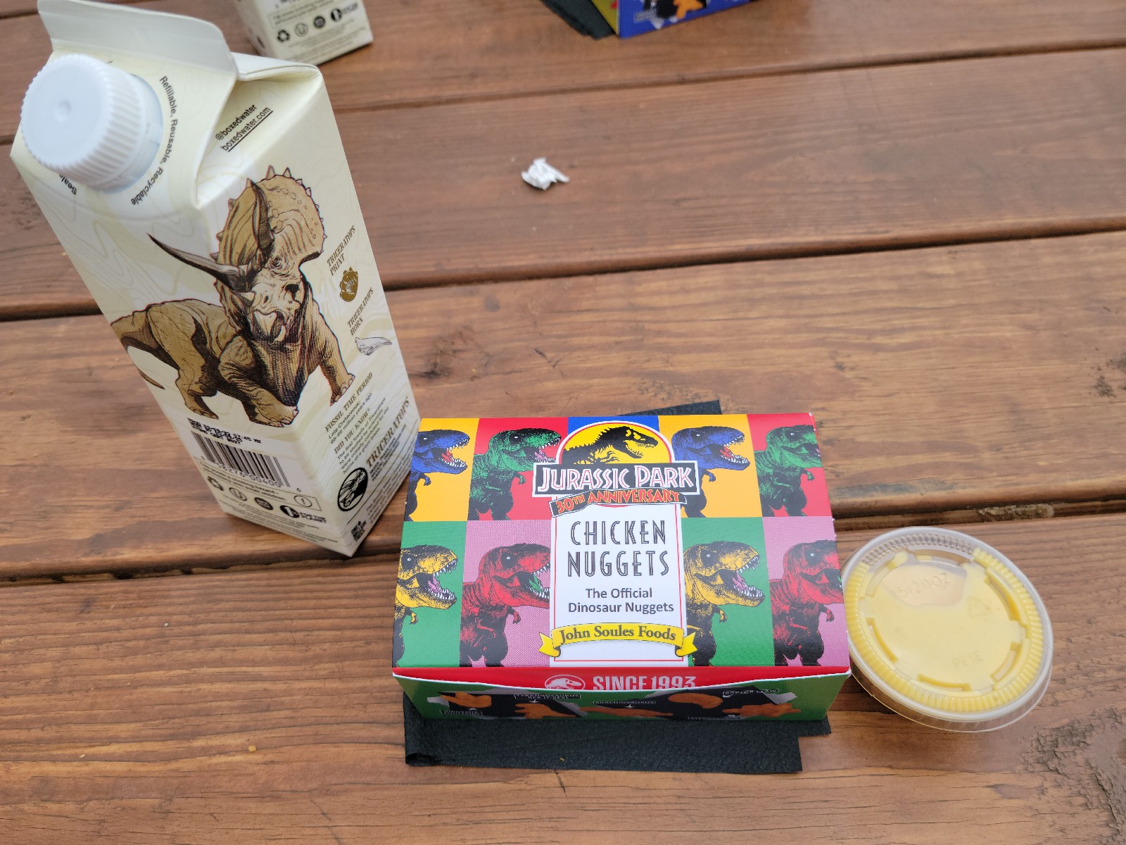 Upon escaping, we exited into a courtyard outside that had several picnic tables set up, where we could sit down and eat the dino nuggets we were given! There were also three dipping sauces available to choose from: honey lime sriracha, togaroshi BBQ, and honey mustard. I went with the honey mustard and Josh went with the BBQ. We also each got a boxed container of water, each of which had various dinosaurs on them. Mine had a Triceratops.