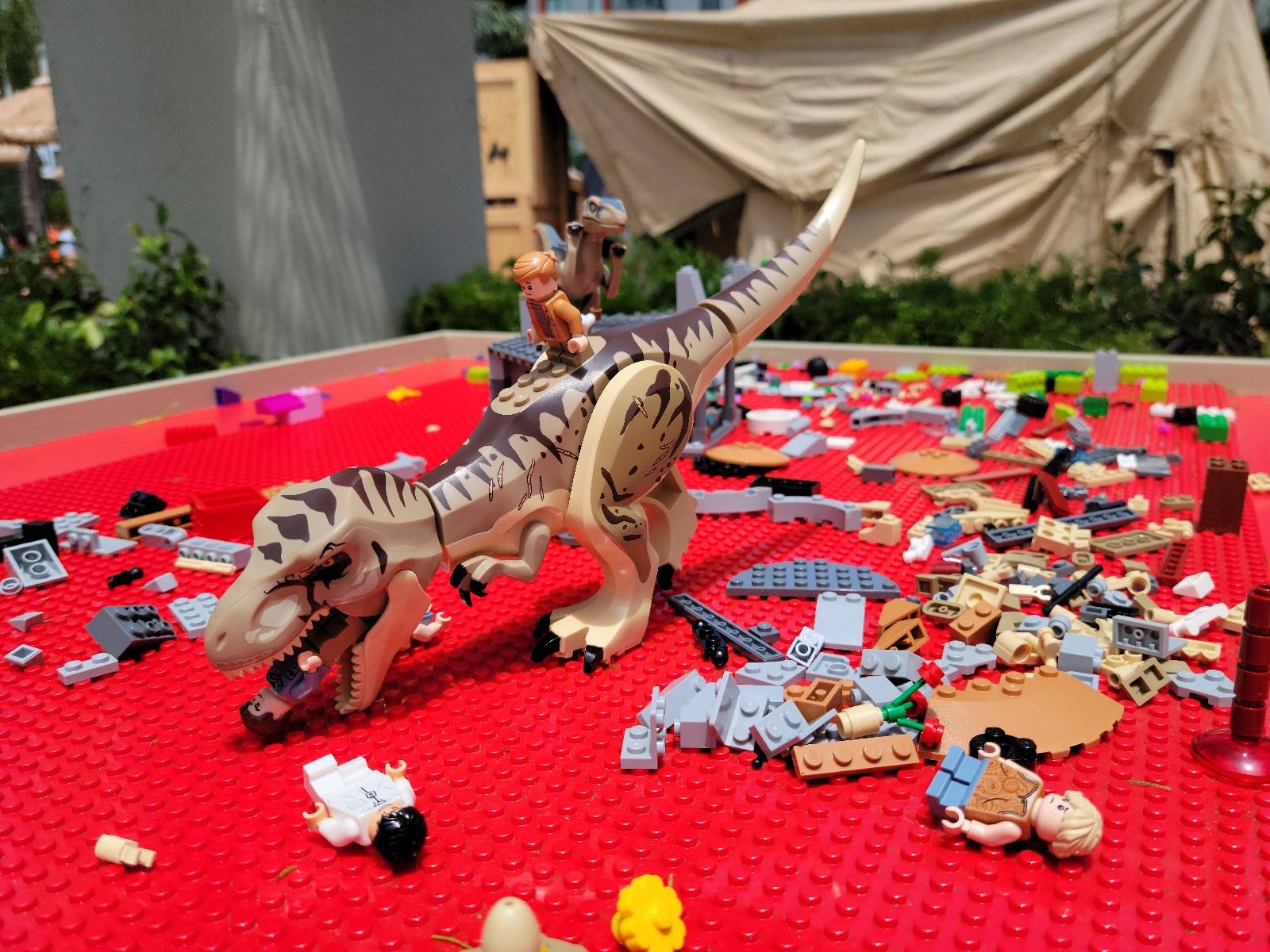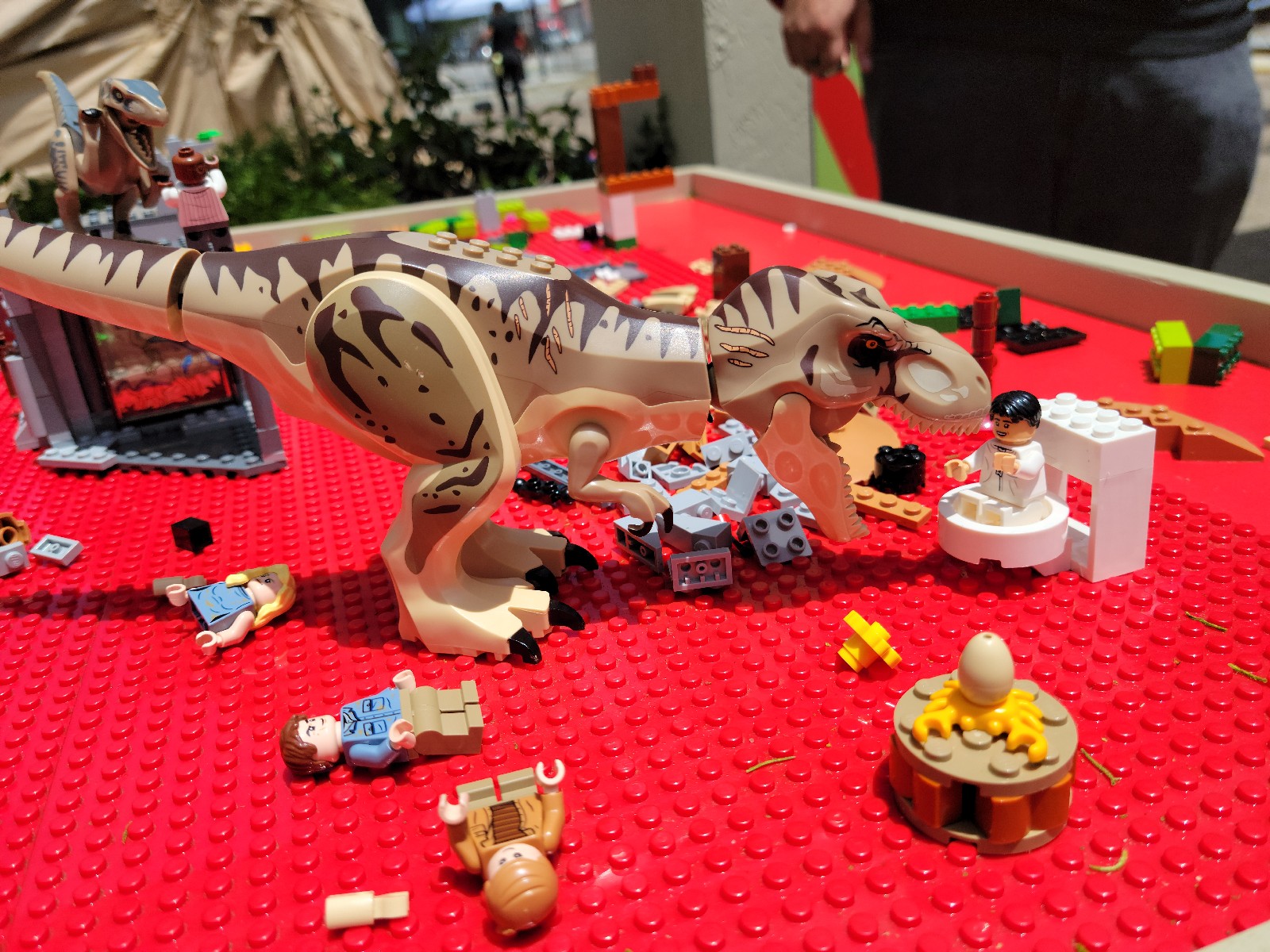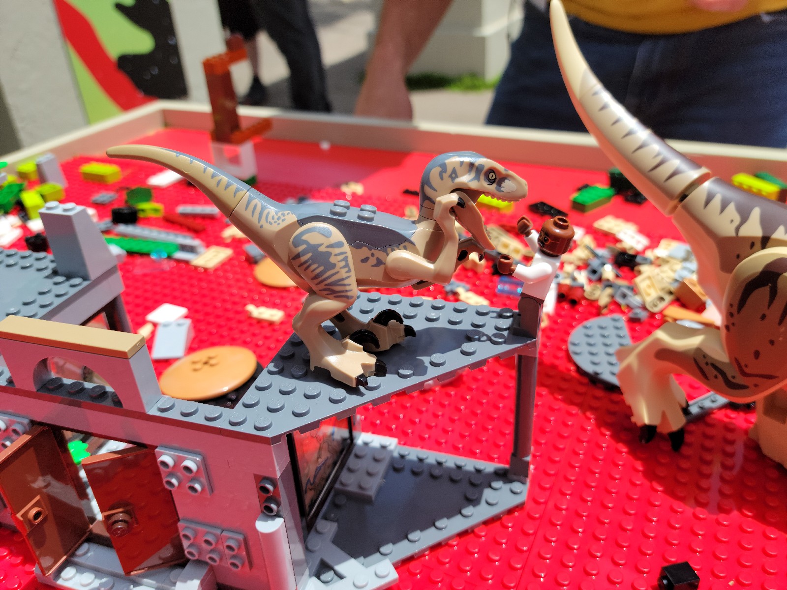 There was a Visitor Center gift shop area, but you couldn’t actually buy anything there. You could just scan the QR codes and buy the items on Amazon. They also had a little LEGO area set up, and we couldn’t resist playing with the Jurassic Park themed LEGOs for a few minutes (we definitely didn’t get enough playtime with LEGOs at the LEGO DreamZzz Watch Party on the IMDboat the night before!). Josh had the brilliant idea to build a toilet and recreate the toilet scene!
