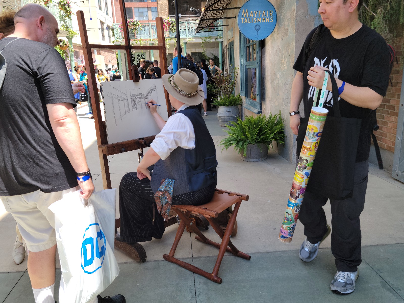 While wandering down the street, we encountered a tap dancer, an artist, and even a set up for the 3 shell game, where you hide something under one of the shells, mix them up, and then someone tries to guess which shell it’s under. We were also approached multiple times by actors warning us to look out for strange things going on, and telling us about the dangerous men who lived at the end of the block.