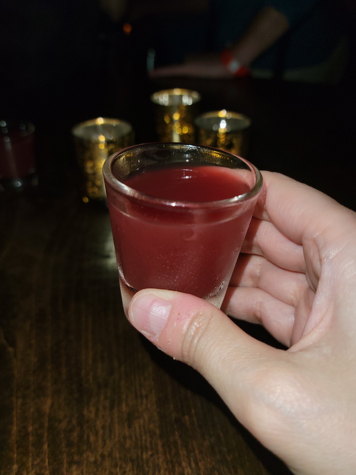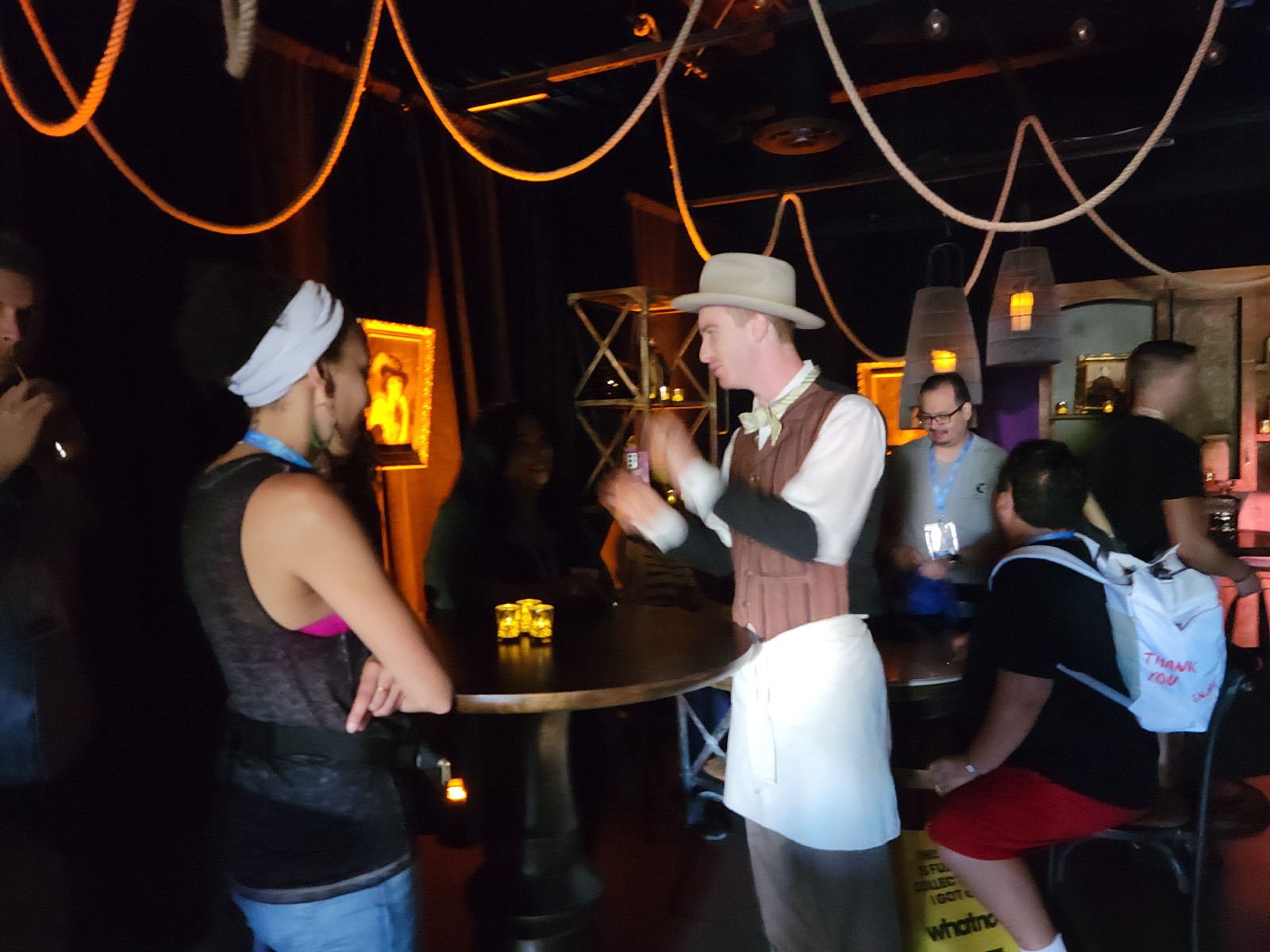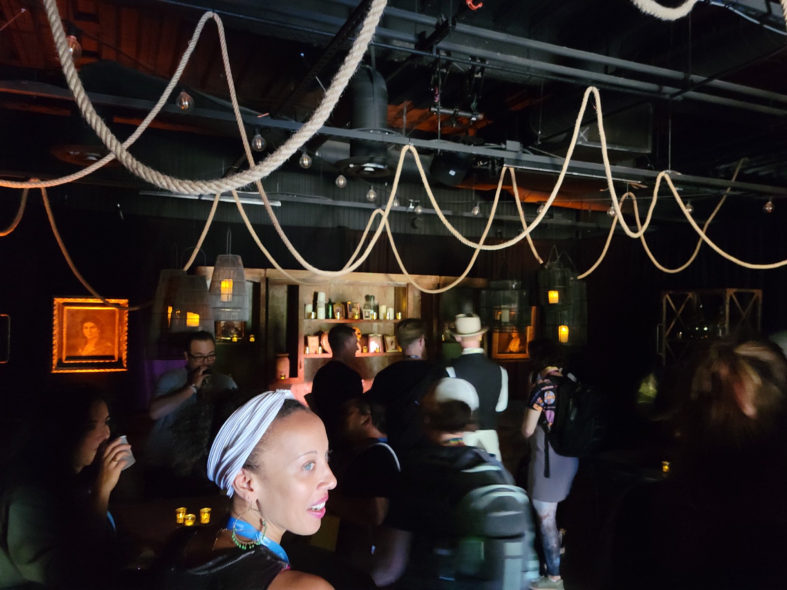 But before we could get very far, we were quickly directed into a room that appeared to be a speakeasy. It was dark and there were tables set for us to stand around. A man with a N’Awlins/Louisiana accent started talking to the room about immortality and the Elixir of Life. He referenced a man named Lestat (a character on the show, who is a vampire) who lived at the house at the end of the block, and had lived there for so long that even his father had done business with him. This man claimed to have obtained the Drink of Immortality from that house, and that all it took was one sip. Shot glasses of a blood red colored drink were distributed to all audience members, and we all raised our shot glasses to toast to immortality.
