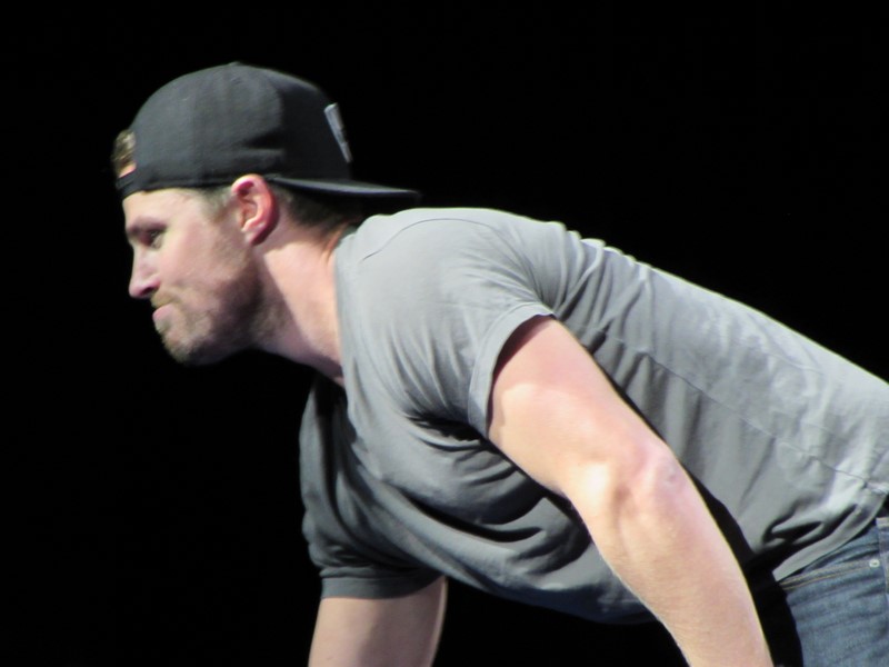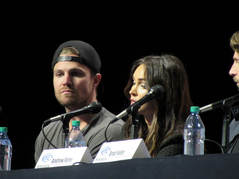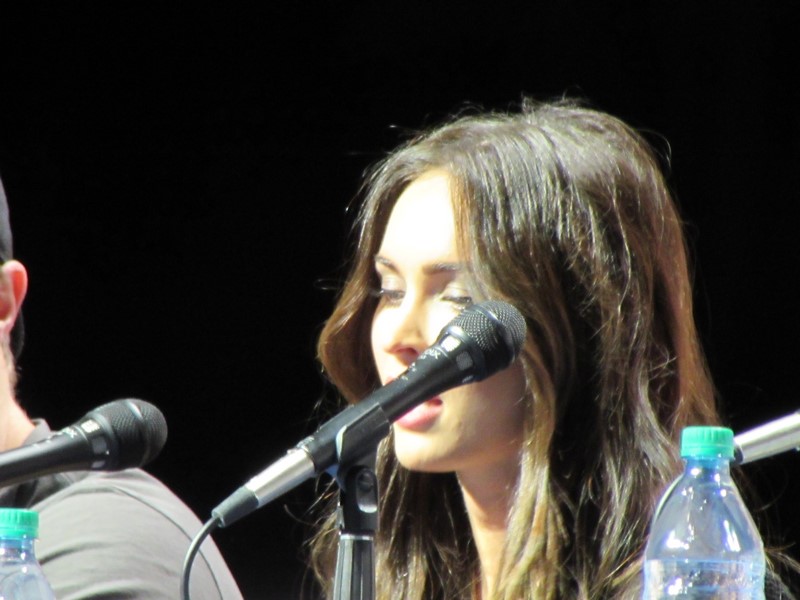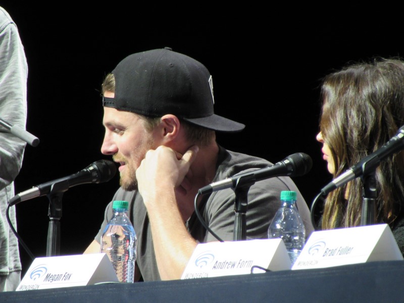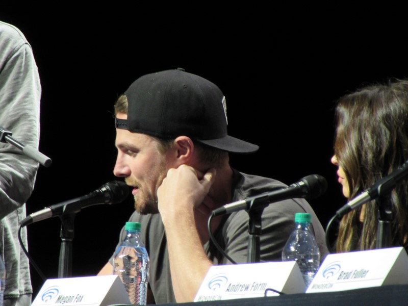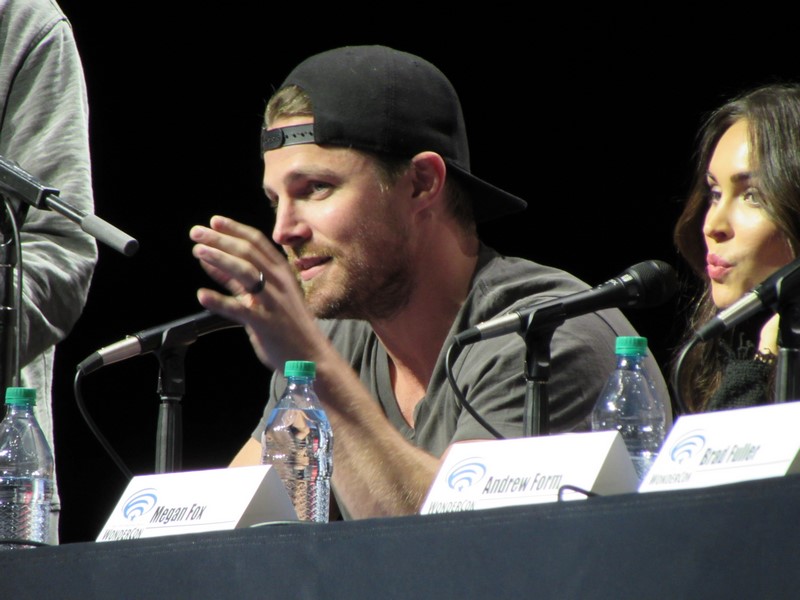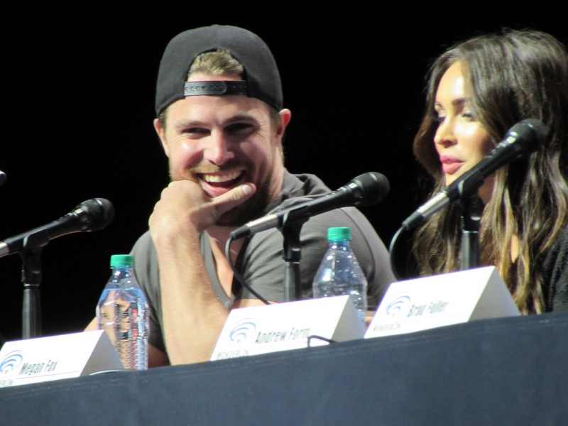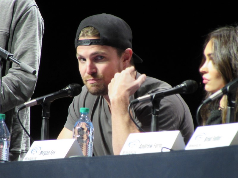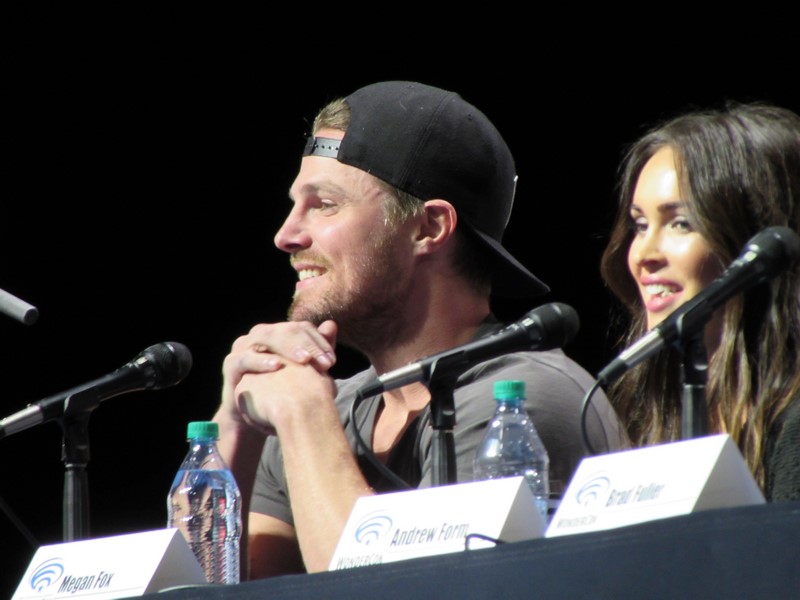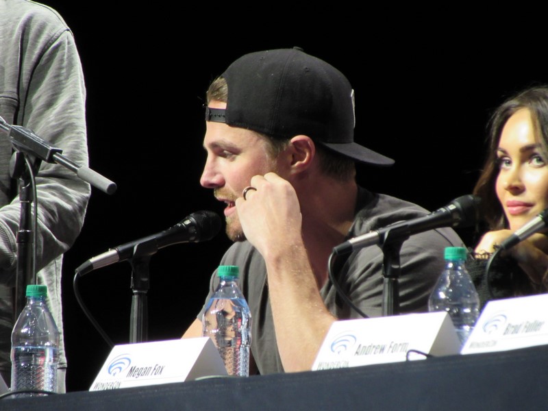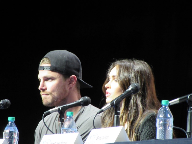An audience member asked what their favorite Ninja Turtles toy was, and Amell answered the ooze, and commented that he used to know all the words to the Vanilla Ice song. The questioner tried to get him to rap the song, but Amell claimed that he didn’t know the words anymore. Megan Fox started signing “Go Ninja, go Ninja, go!” and said she remembers the dance. To answer the question, she said she didn’t have any Ninja Turtles toys, though she had a lunch box.