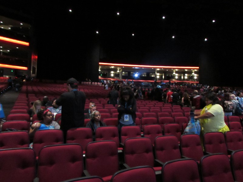Then I walked down a long empty chute barricaded by metal railings to the entrance of the Microsoft Theater, where three doors were open with metal detectors. However, before entering, an attendant was scanning badges yet again. Then my bags were searched as I passed through the metal detectors. They didn’t seem to care about my water bottle or granola bars. The whole process of going over to the Microsoft Theater was a lot quicker and less painless than I had anticipated. However, it could have been because there weren’t really any overly popular panels going on. I had plenty of time to take a bathroom break and find myself a seat in the third row.