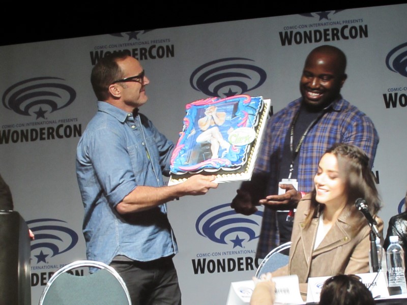 Chloe Bennet actually crashed the panel with a birthday cake for Clark Gregg, whose birthday is apparently April 2nd, so the room sang happy birthday to him, and he blew out the candles. Unfortunately, Gregg was not able to pass out a piece of cake for everyone in the audience, but that’s okay, Agent Coulson.