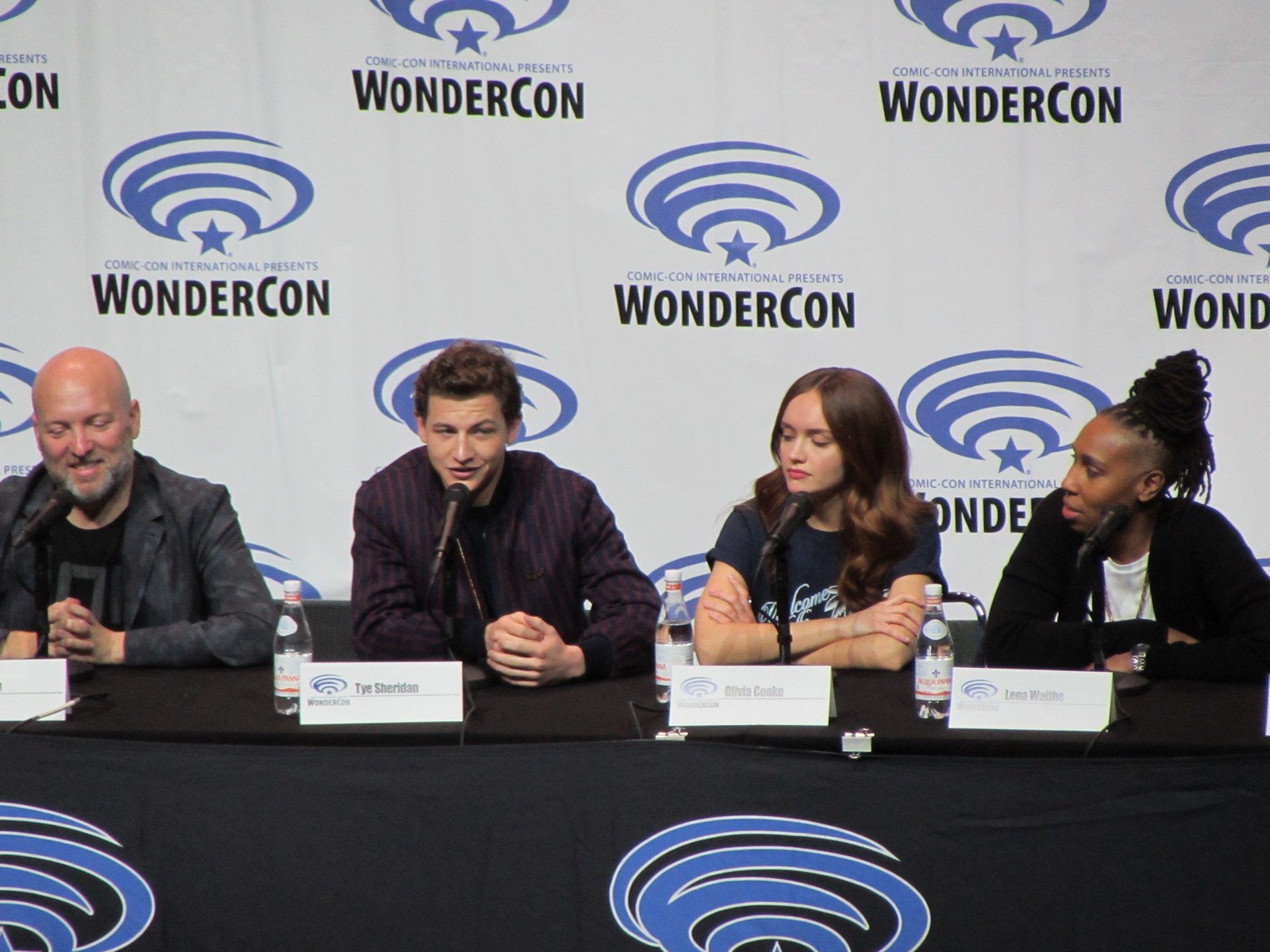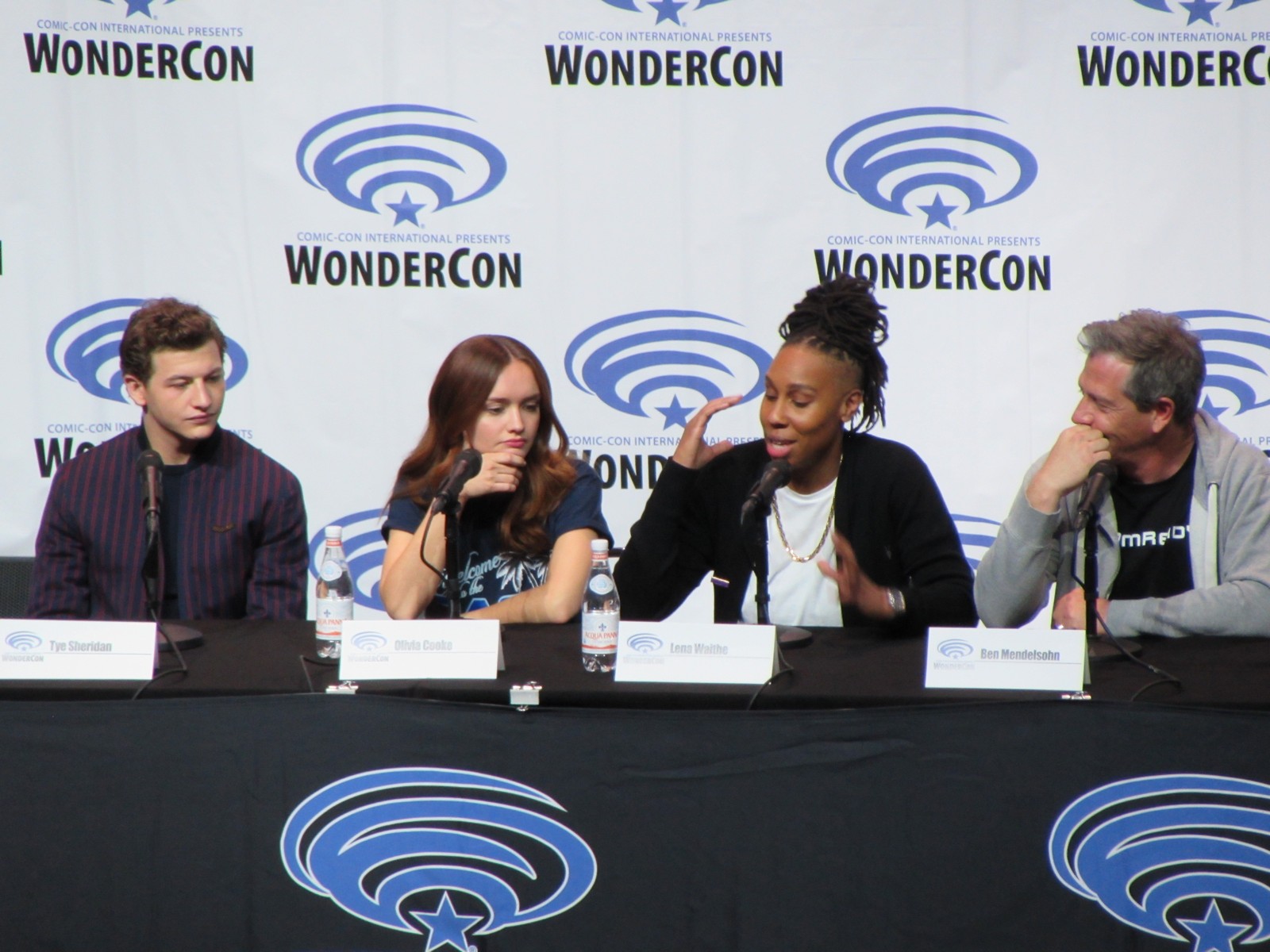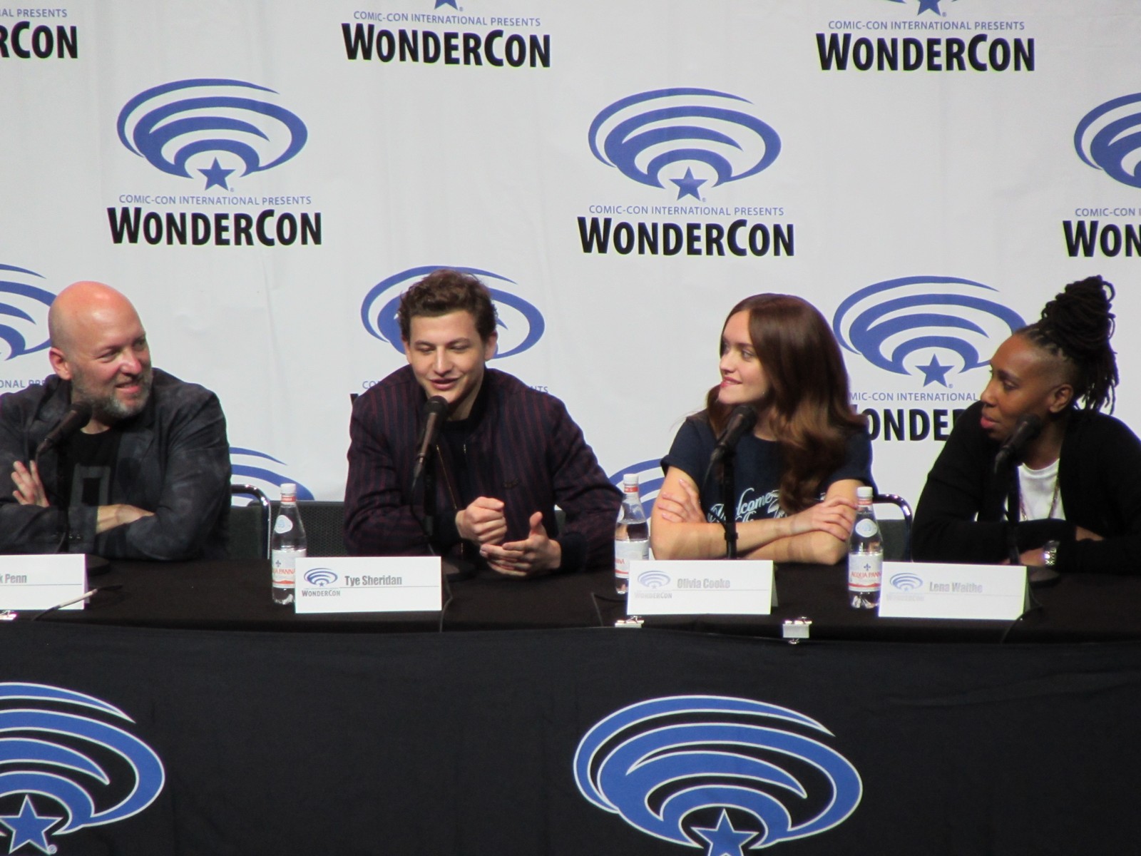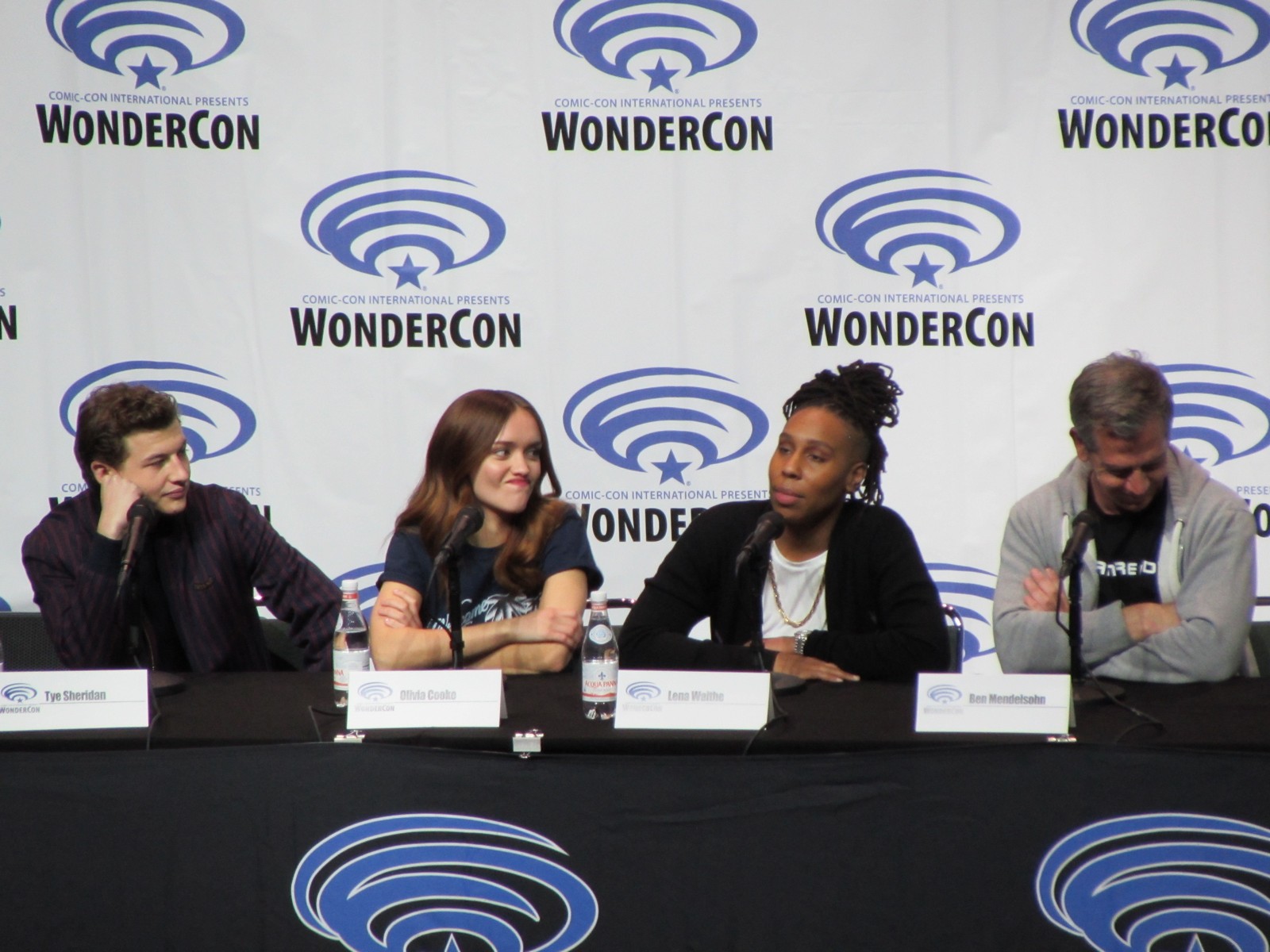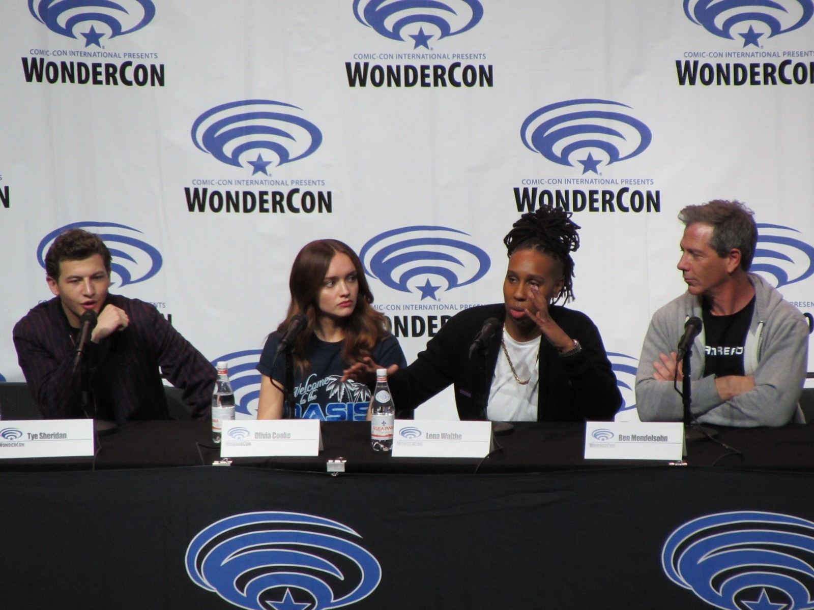 Scott Mantz, who is from Access Hollywood, moderated the panel, and gave the film a pretty brief, but glowing review, appreciating all of the Easter eggs there are to find in the film. On the panel were author Ernest Cline, Zak Penn, the second Screenwriter (Ernest Cline started the screenplay), Tye Sheridan, who plays Wade Watts, Olivia Cooke, who plays a fellow Gunter (name of the people searching for the treasure) and love interest, Art3mis (that’s her in-OASIS name), Lena Waithe, who plays Aech (Wade’s friend), Ben Mendelsohn (who plays Sorrento, the villain), Philip Zhao, who plays Sho, and Win Morisaki who plays Daito (these brothers are also fellow Gunters in search of the treasure within the OASIS).