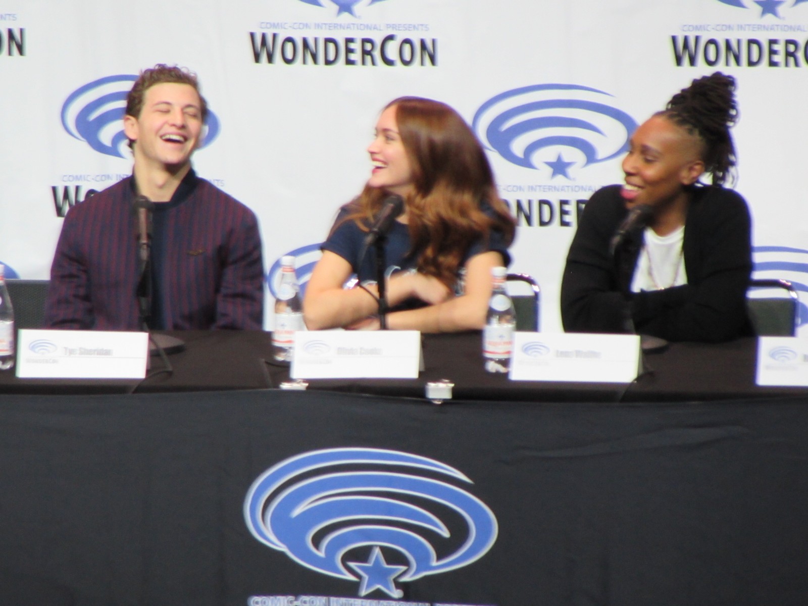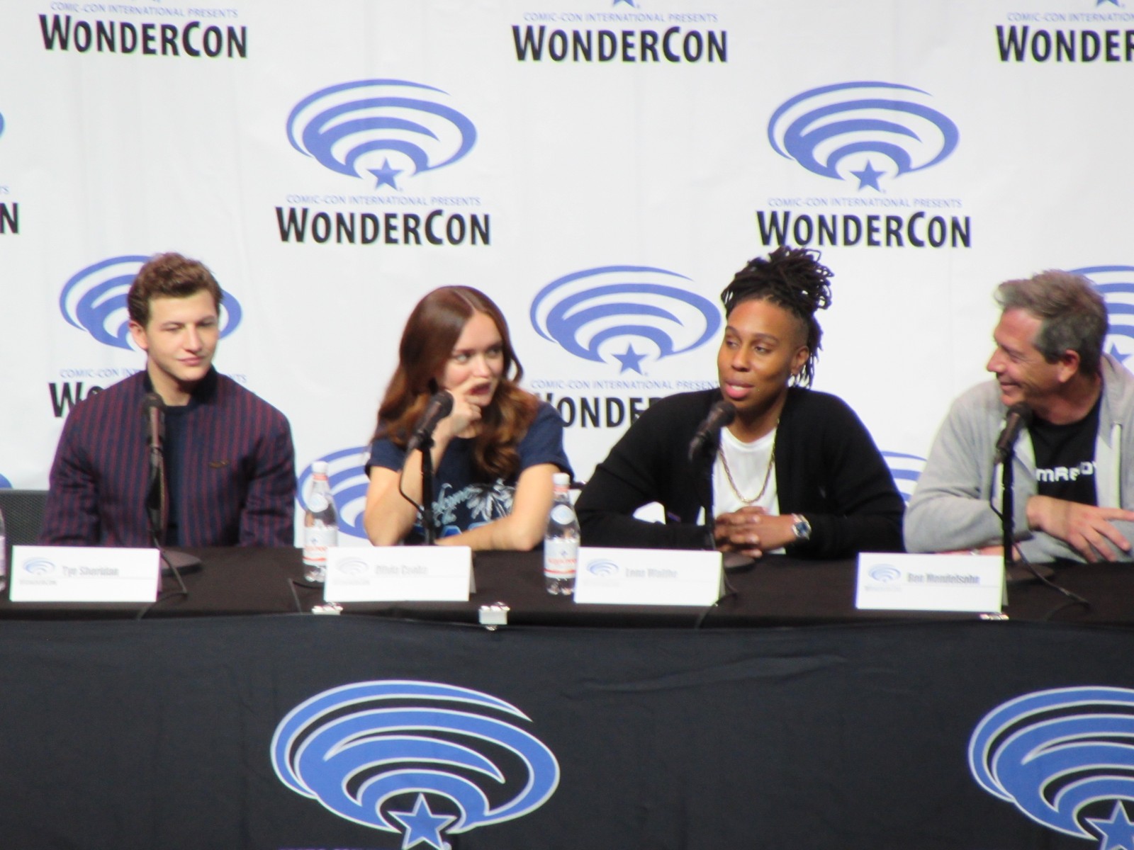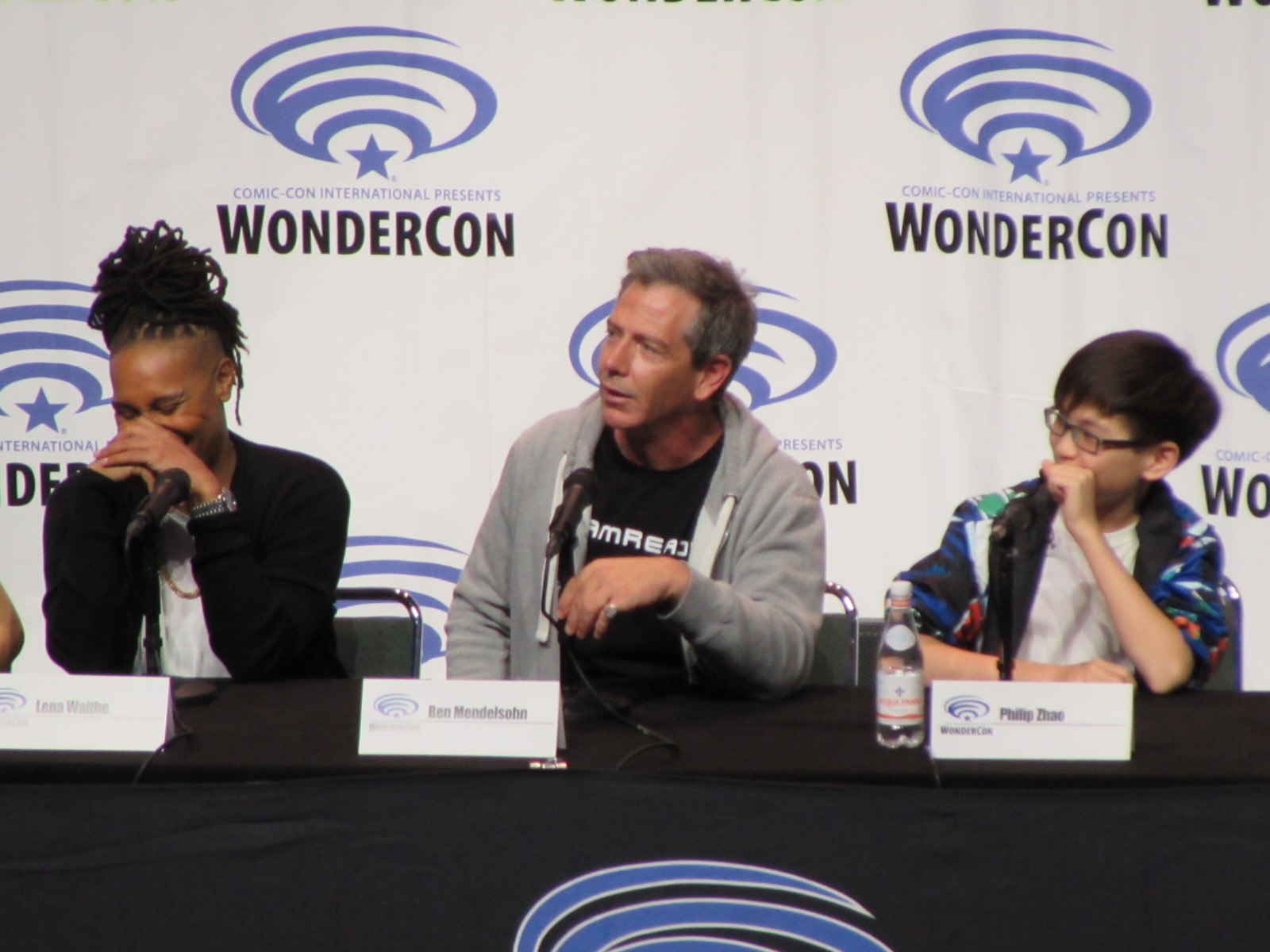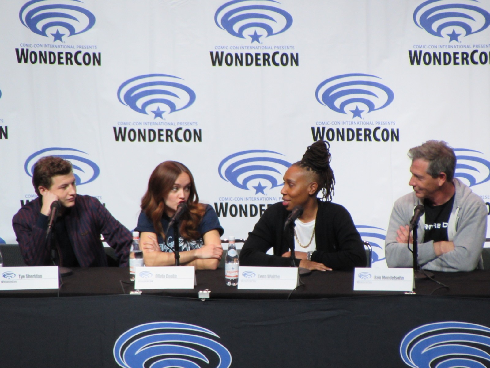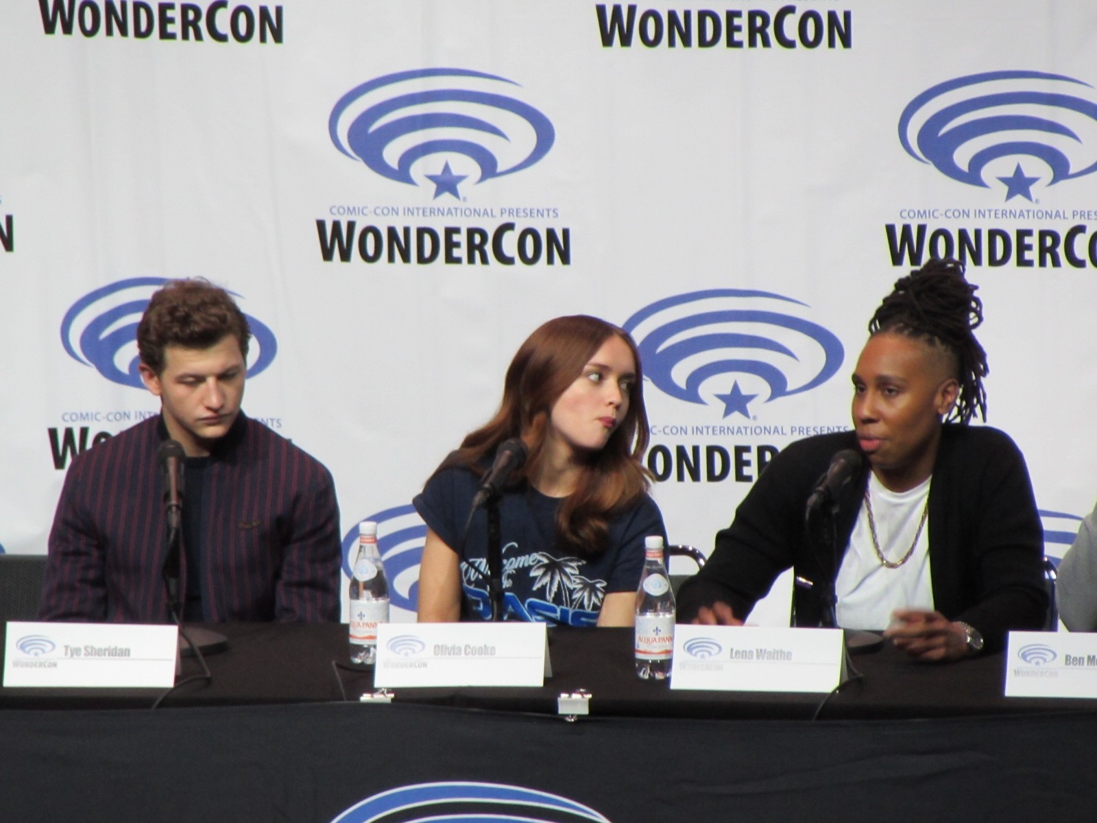 Scott Mantz, who is from Access Hollywood, moderated the panel, and gave the film a pretty brief, but glowing review, appreciating all of the Easter eggs there are to find in the film. On the panel were author Ernest Cline, Zak Penn, the second Screenwriter (Ernest Cline started the screenplay), Tye Sheridan, who plays Wade Watts, Olivia Cooke, who plays a fellow Gunter (name of the people searching for the treasure) and love interest, Art3mis (that’s her in-OASIS name), Lena Waithe, who plays Aech (Wade’s friend), Ben Mendelsohn (who plays Sorrento, the villain), Philip Zhao, who plays Sho, and Win Morisaki who plays Daito (these brothers are also fellow Gunters in search of the treasure within the OASIS).
