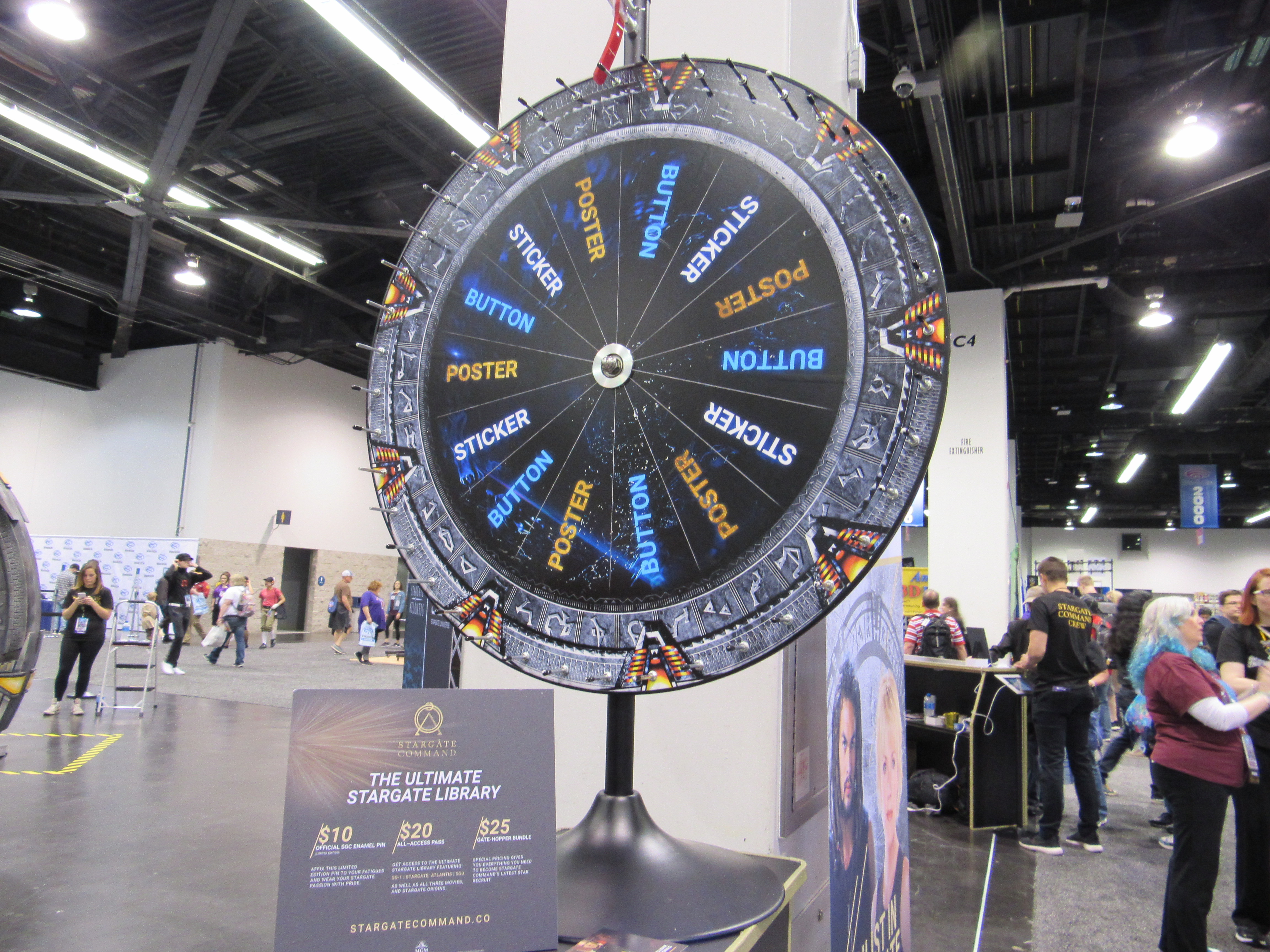Another fun booth was Stargate Command. I actually have recently been binging Stargate: SG-1 and Stargate: Atlantis, so this was of particular interest to me. They had “stargates” set up that you could take a picture in front of to make it look like you had just come through. There was also a wheel that you could spin to win a prize. I won a button!
