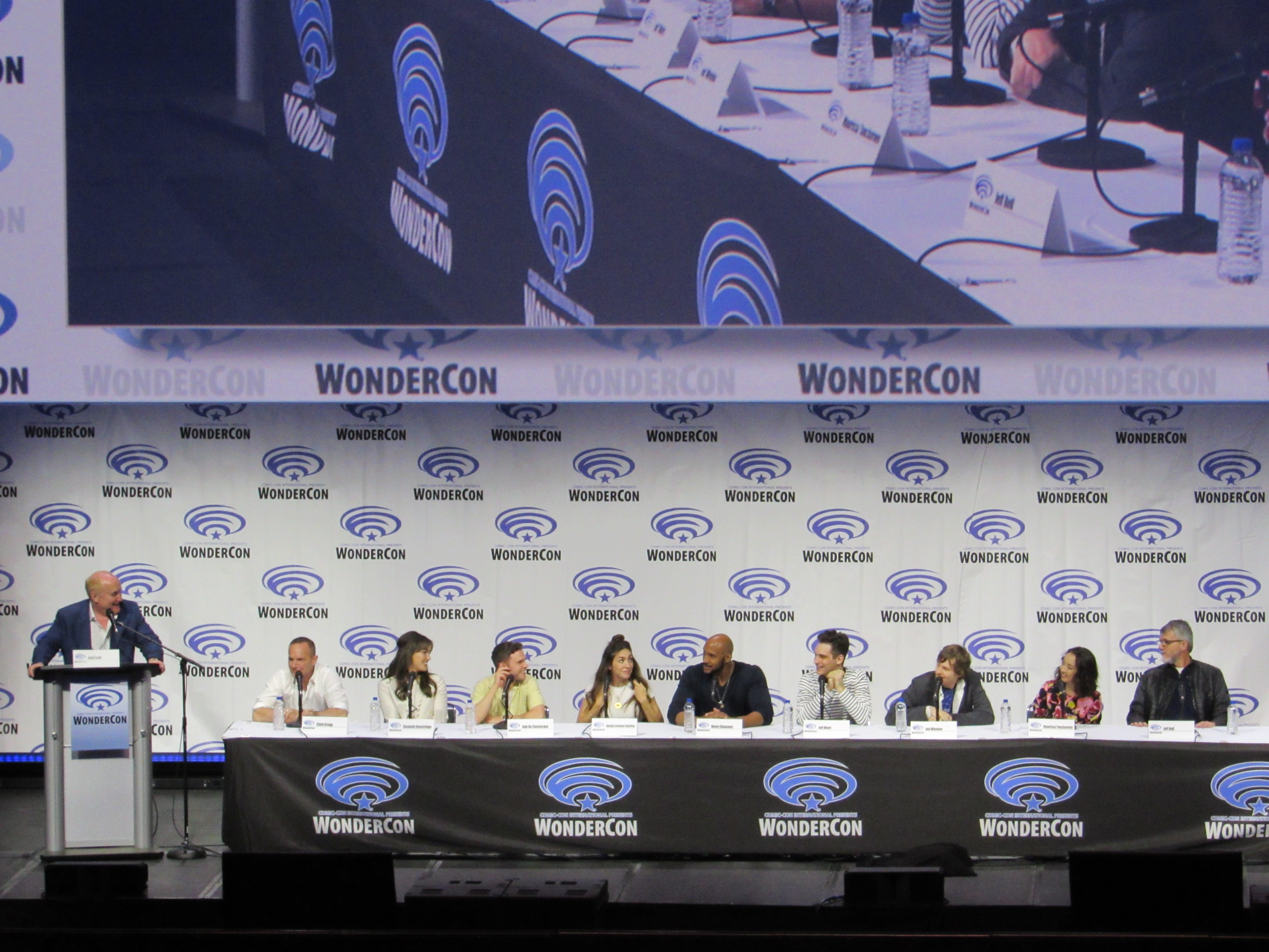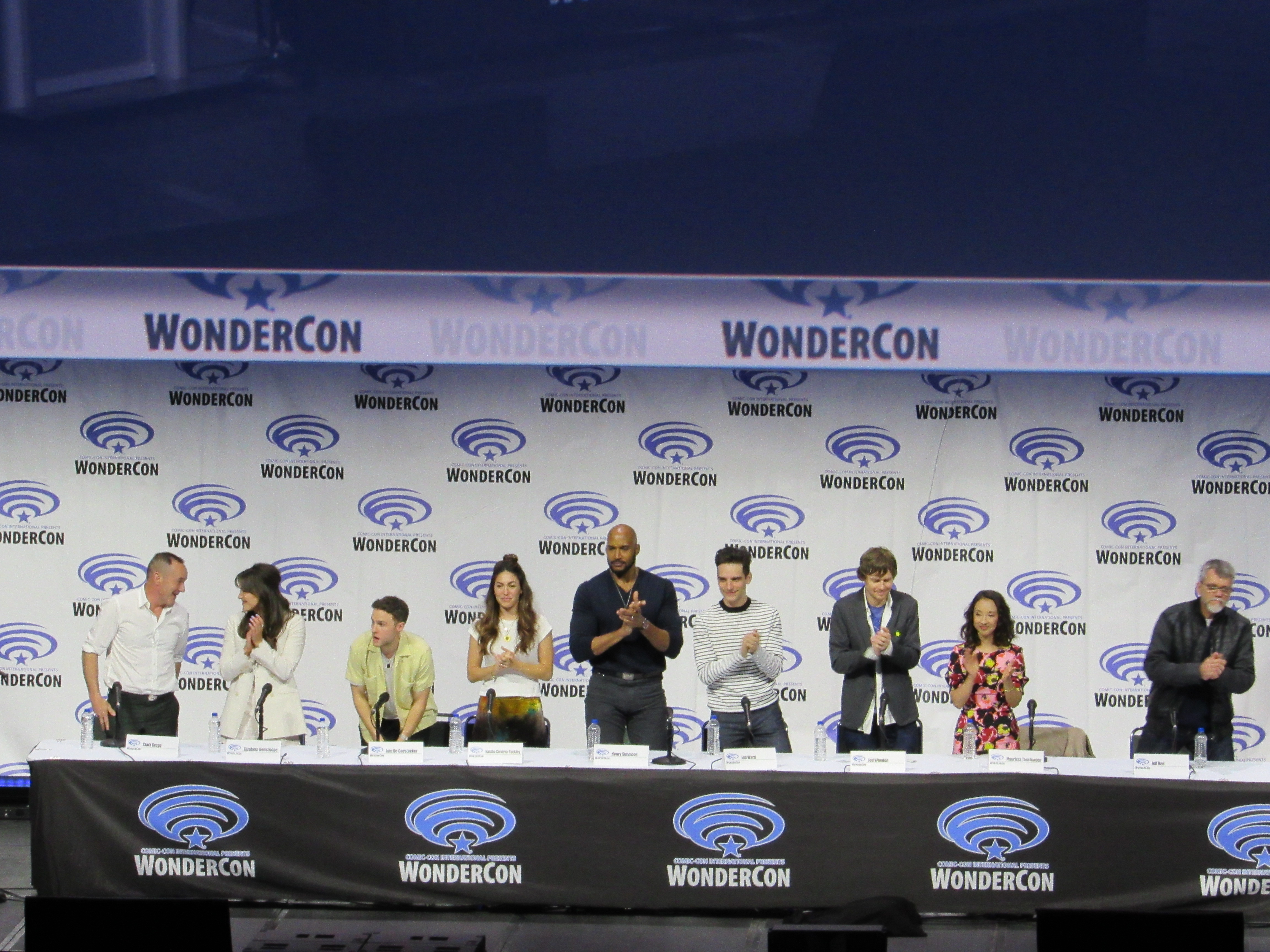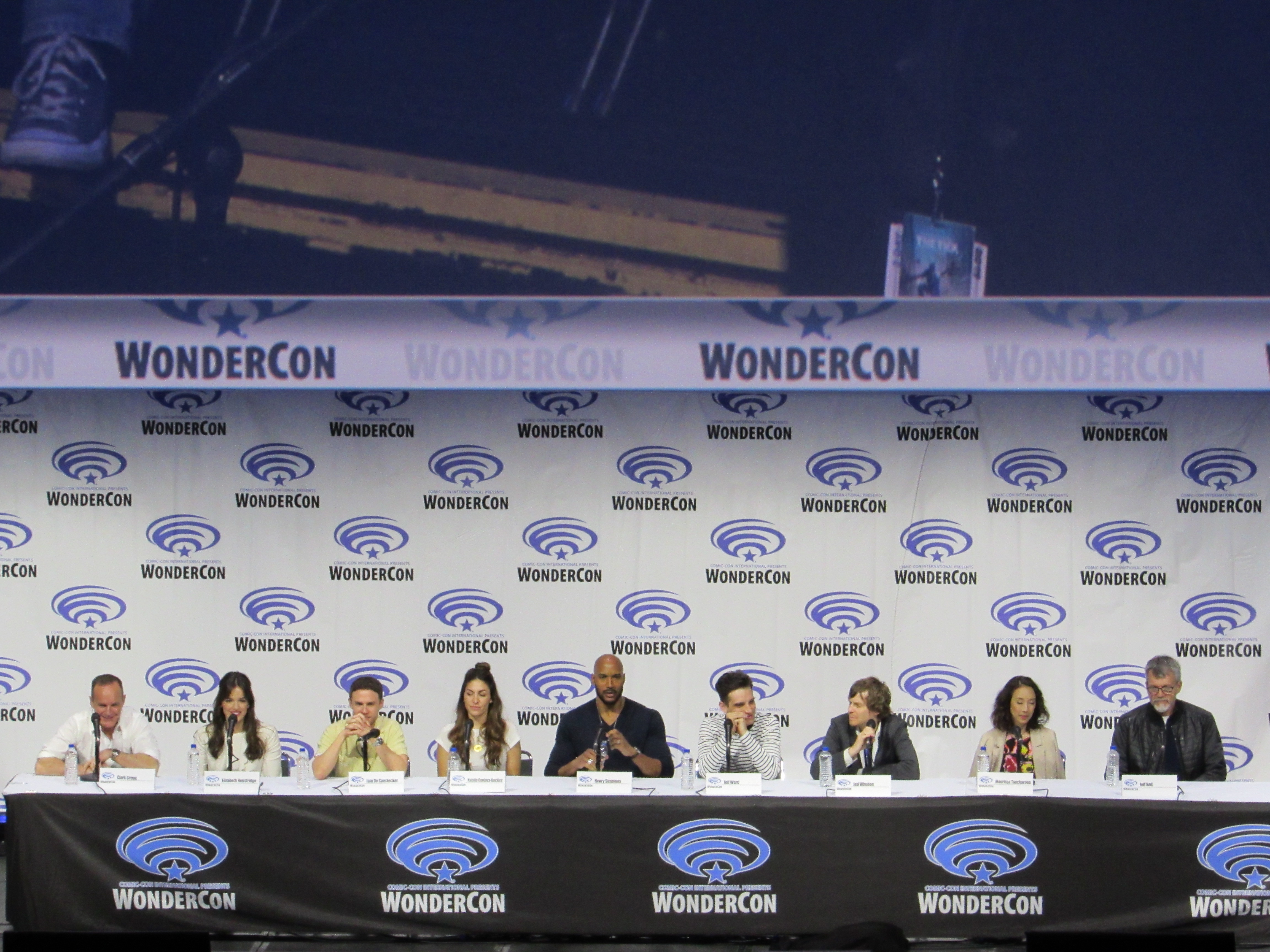 So when Jeph Loeb asked Clark Gregg if he had a birthday wish, Clark joked, “I would like to know what song people just sang.” He then spoke about how lucky he was to have to chance to direct the first episode of Season 6, and asked Jeph Loeb if there was any way to see a few minutes of it. After a bit of build up, the entire Season 6 premiere episode was shown to the audience. (It seemed like this was supposed to be a surprise, but the fact that this was going to happen was clearly stated in the WonderCon schedule.)