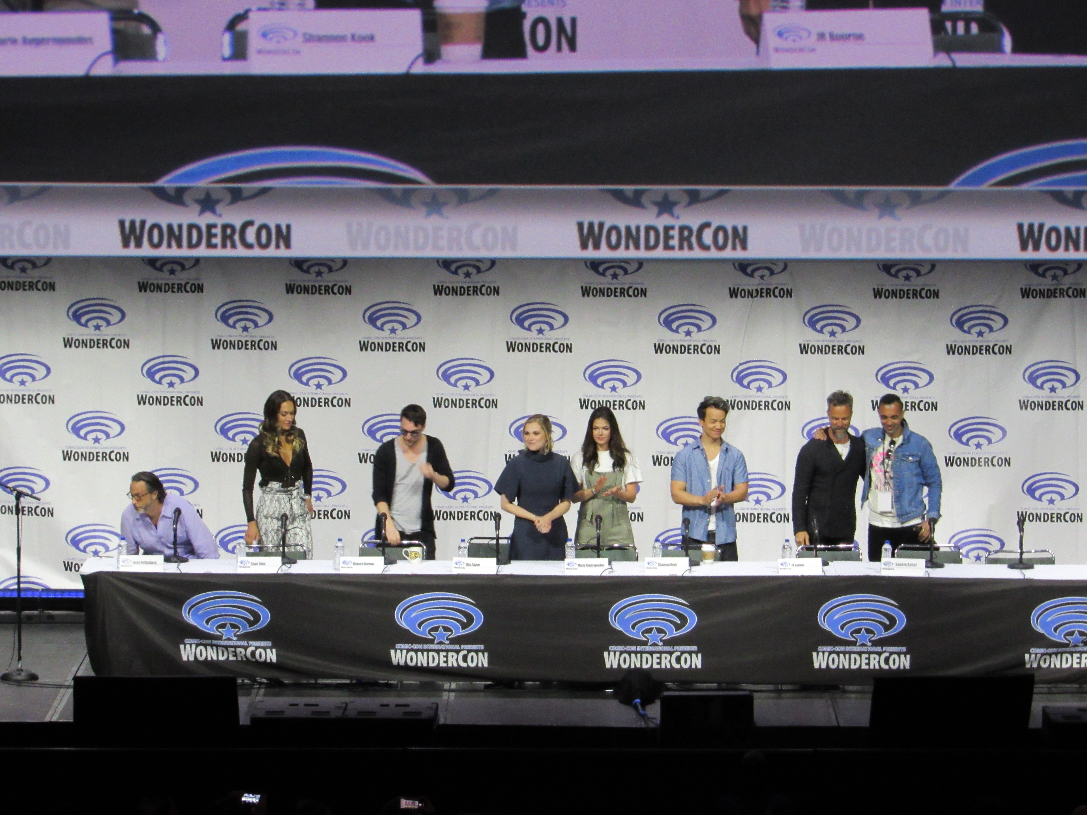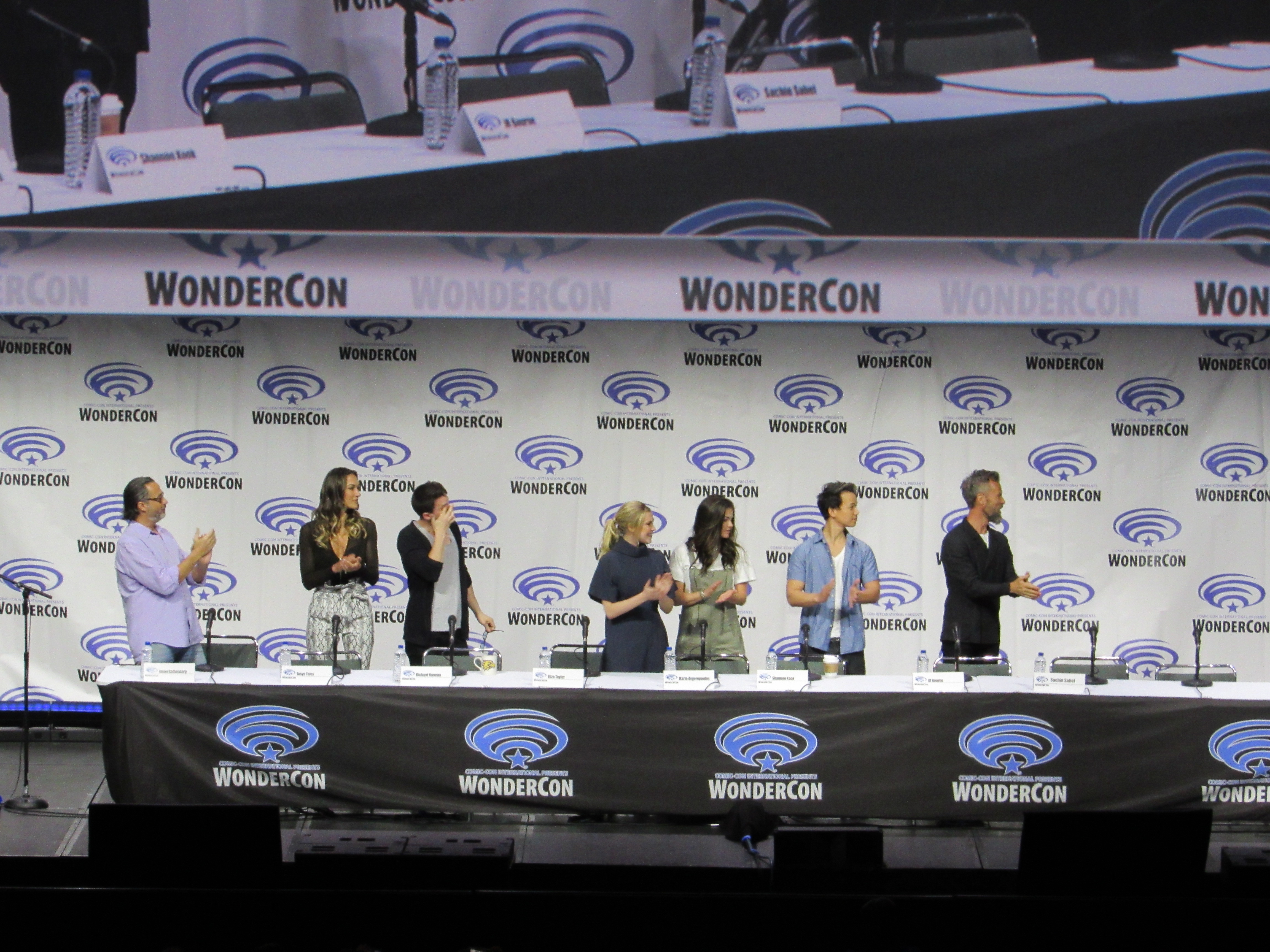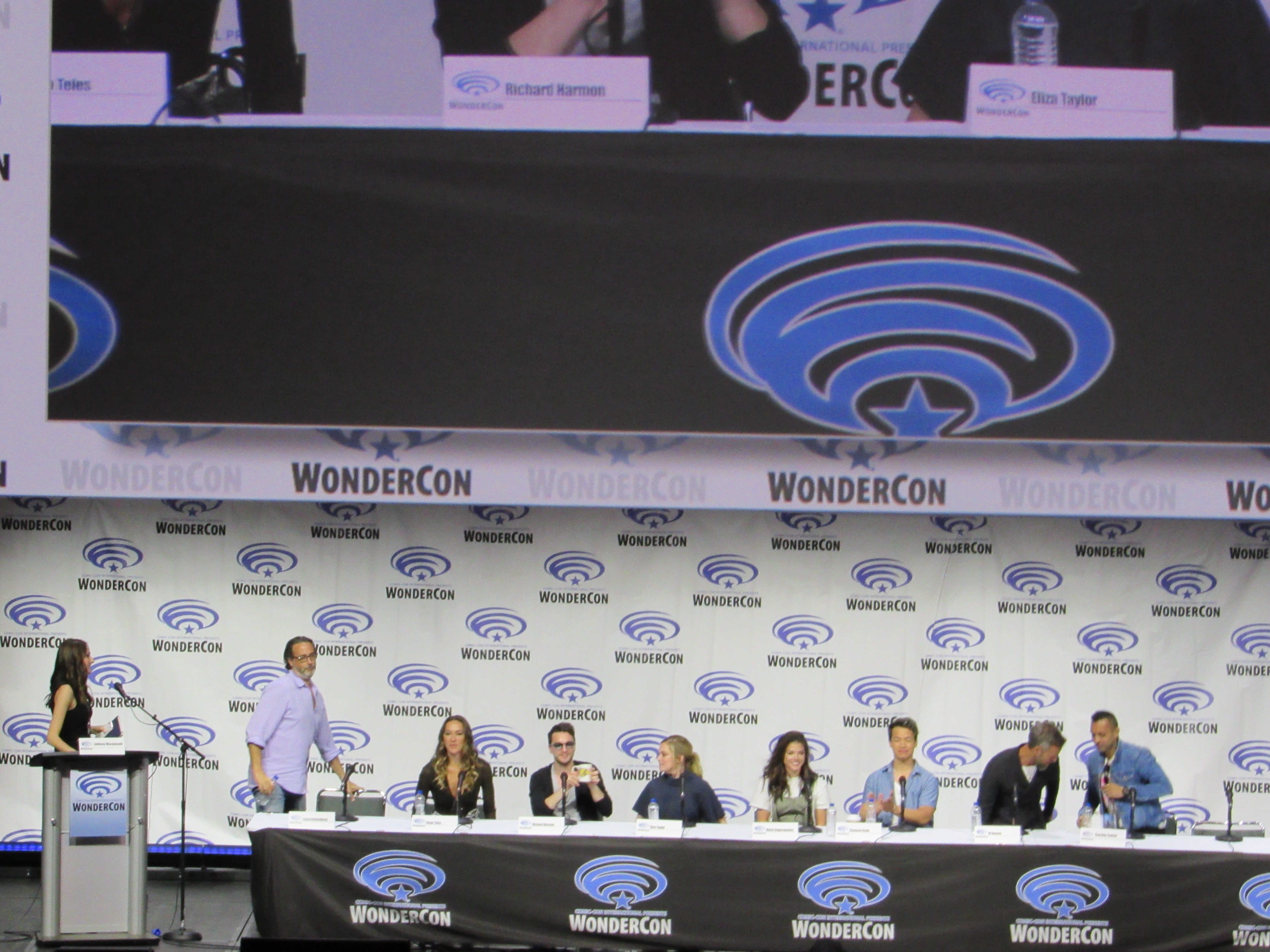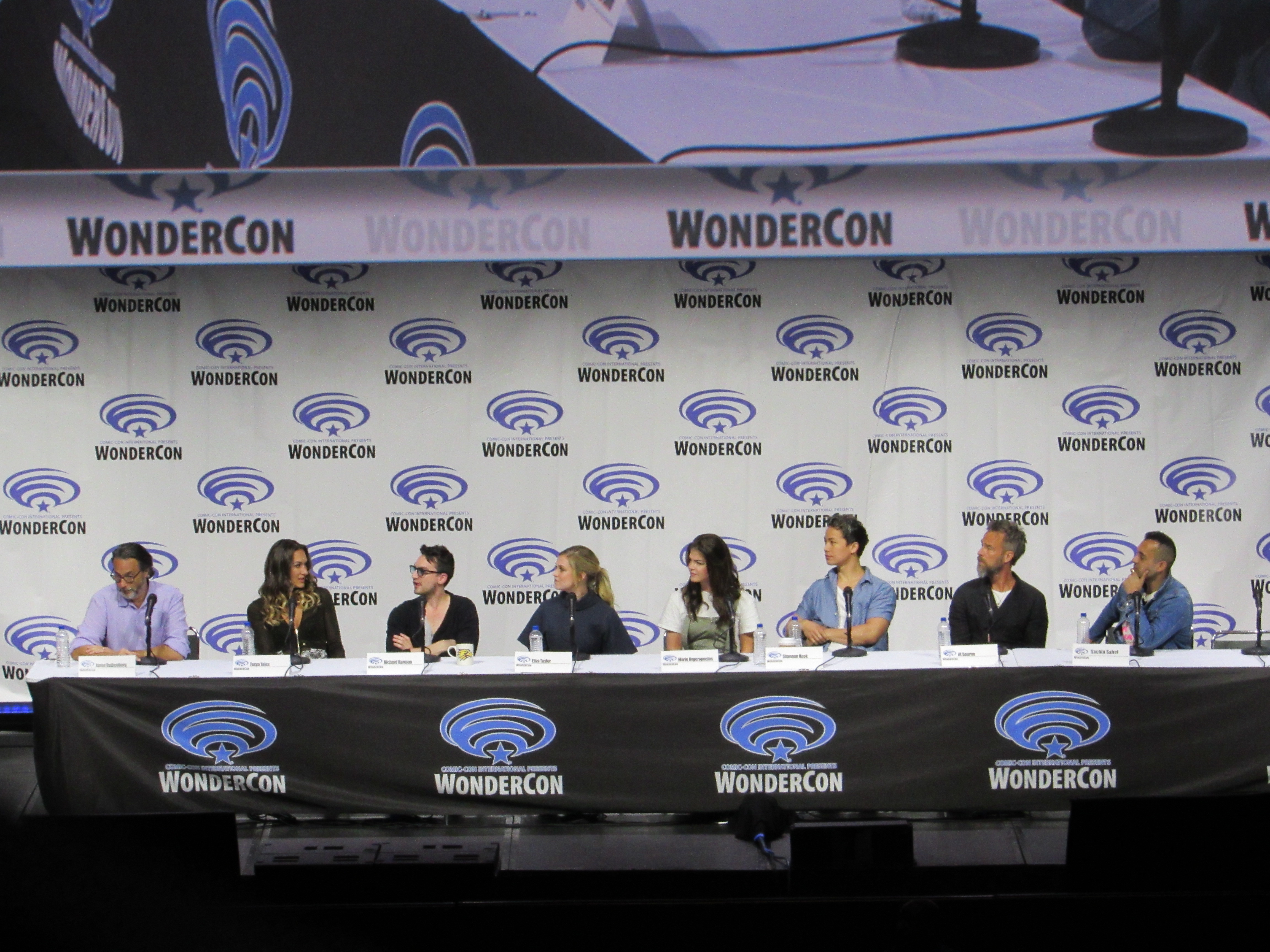 After the episode, the panelists came out on stage, which included showrunner Jason Rothenberg and actors Tasya Teles (Echo), Richard Harmon (Murphy), Eliza Taylor (Clarke), Marie Avgeropoulos (Octavia), Shannon Kook (Jordan), JR Bourne (Russell), and Sachin Sahel (Jackson). Bob Morley (Bellamy) had been originally scheduled to attend the panel, but apparently couldn’t make it, so Sachin, who hadn’t been scheduled to attend, took his place. Bob Morley’s absence was a bit of a disappointment for me, as last year Eliza Taylor hadn’t been able to make it to the WonderCon panel, and I haven’t seen the two of them together on a panel since WonderCon 2016!