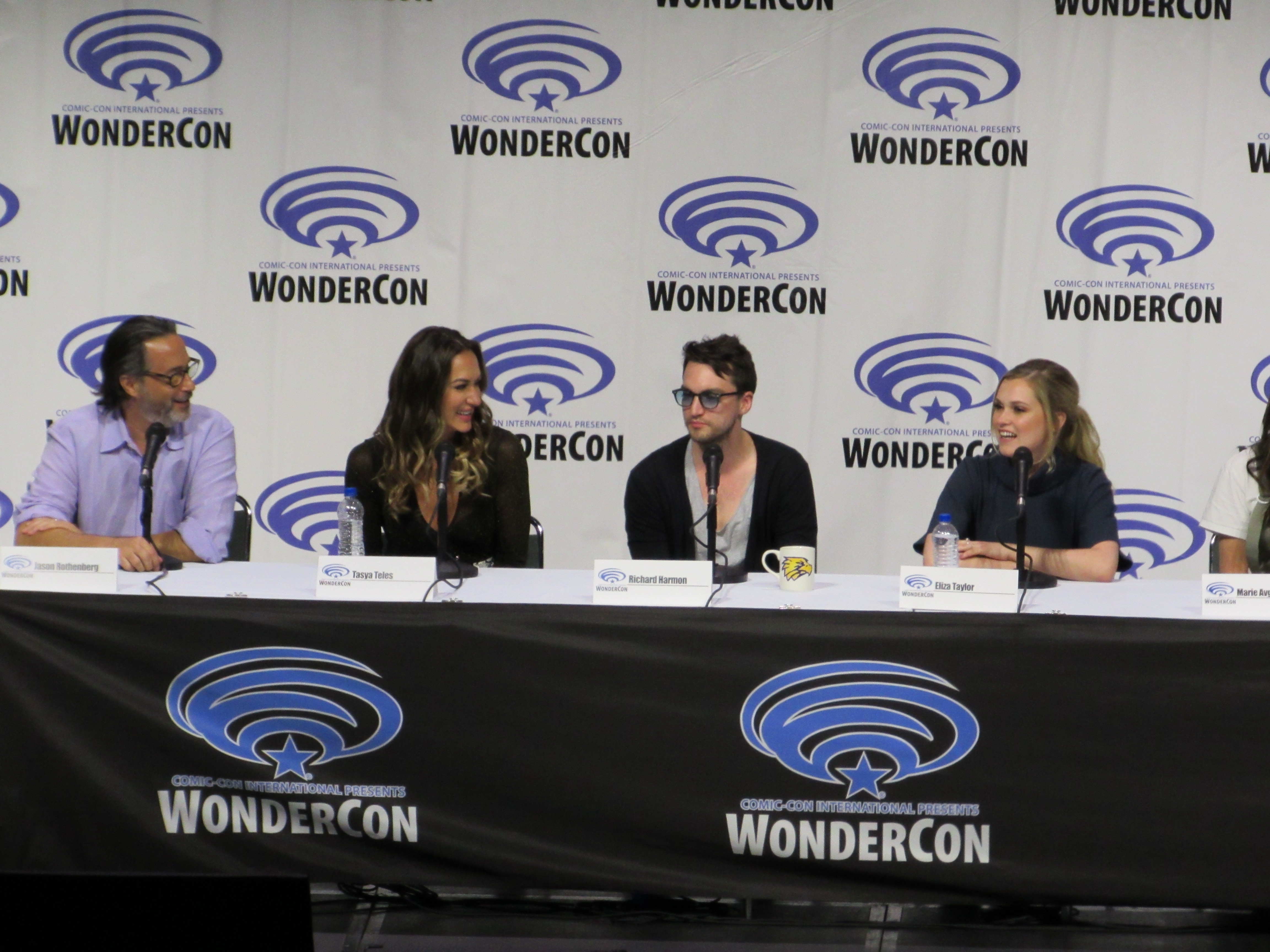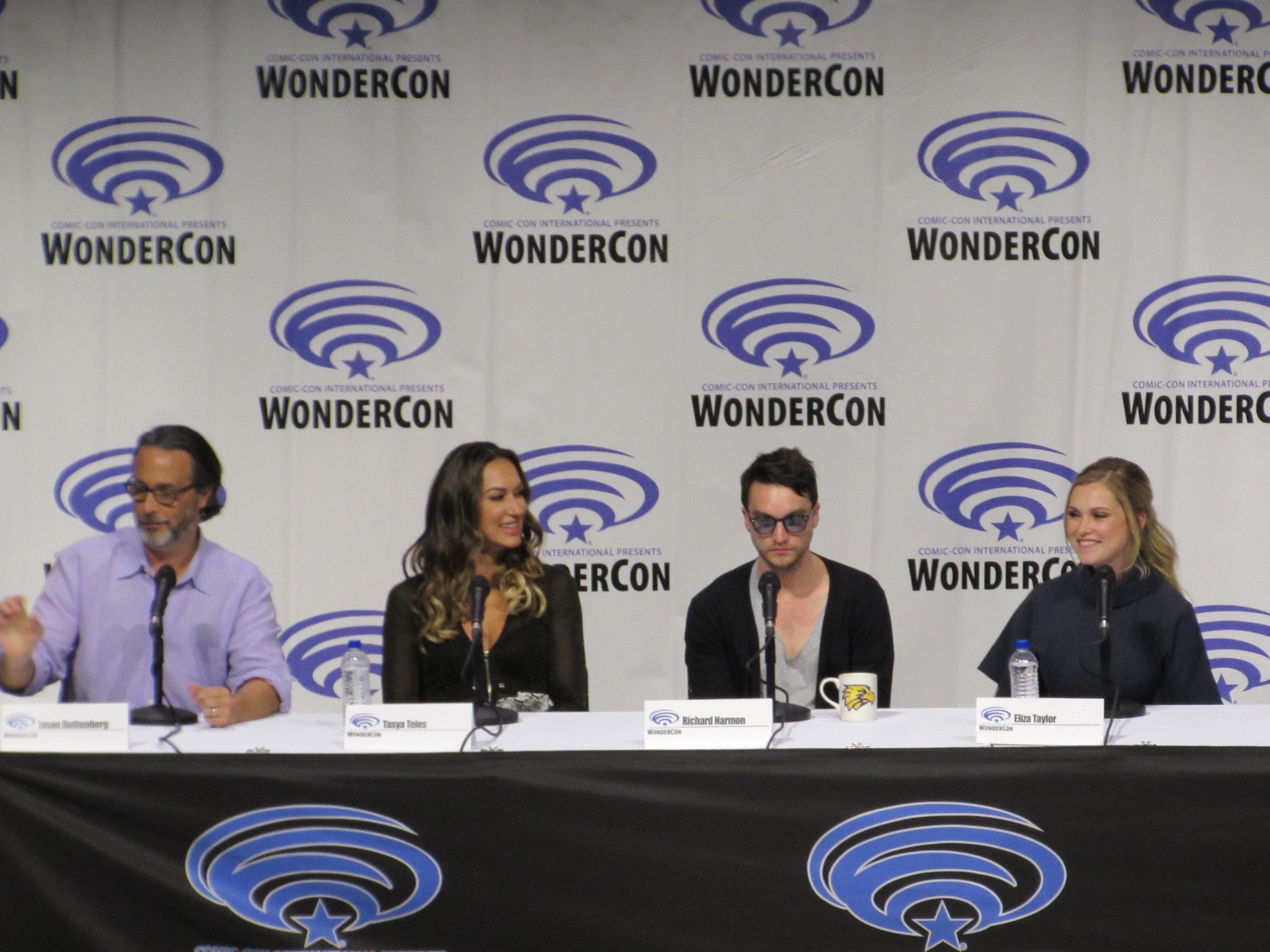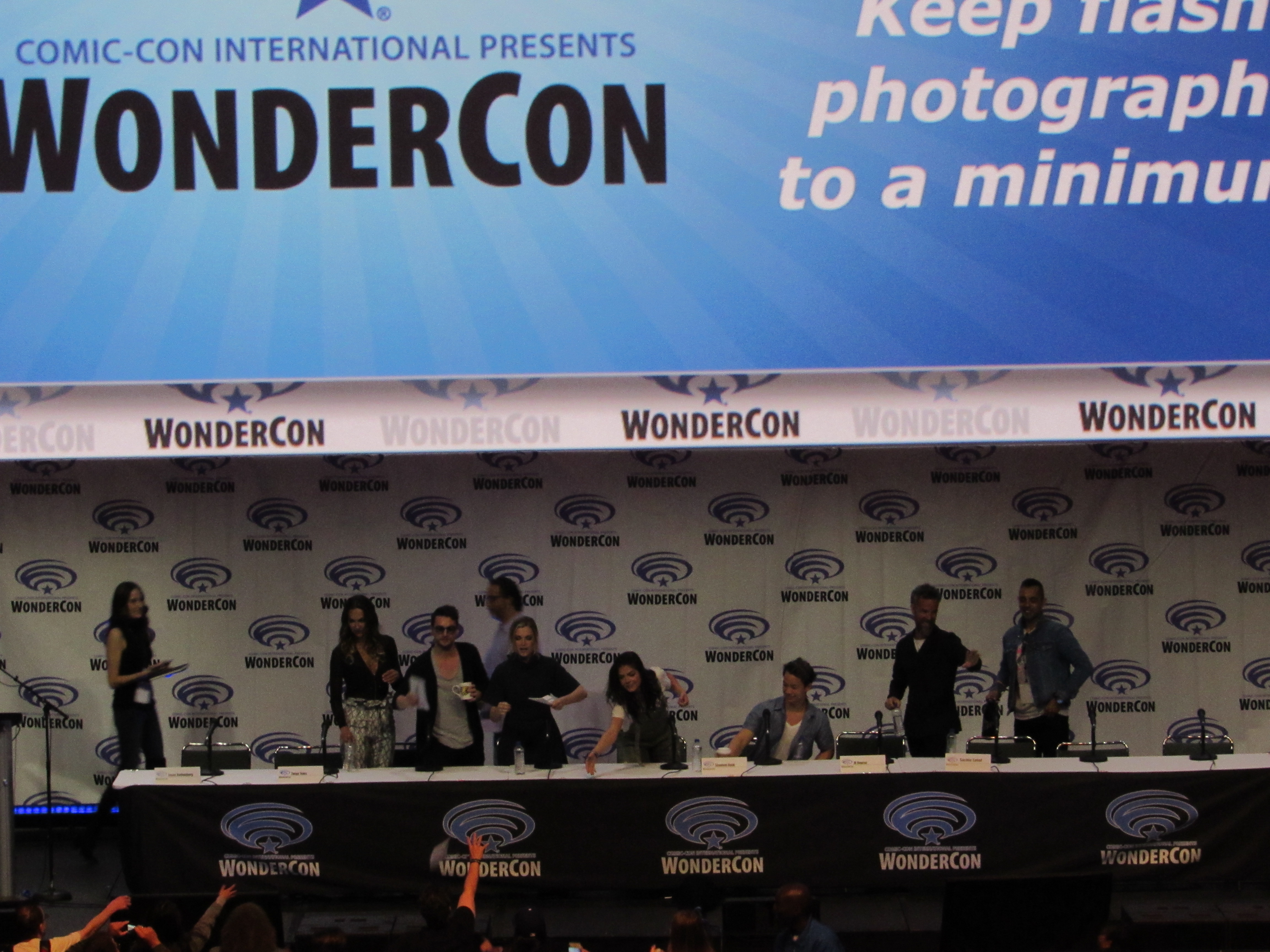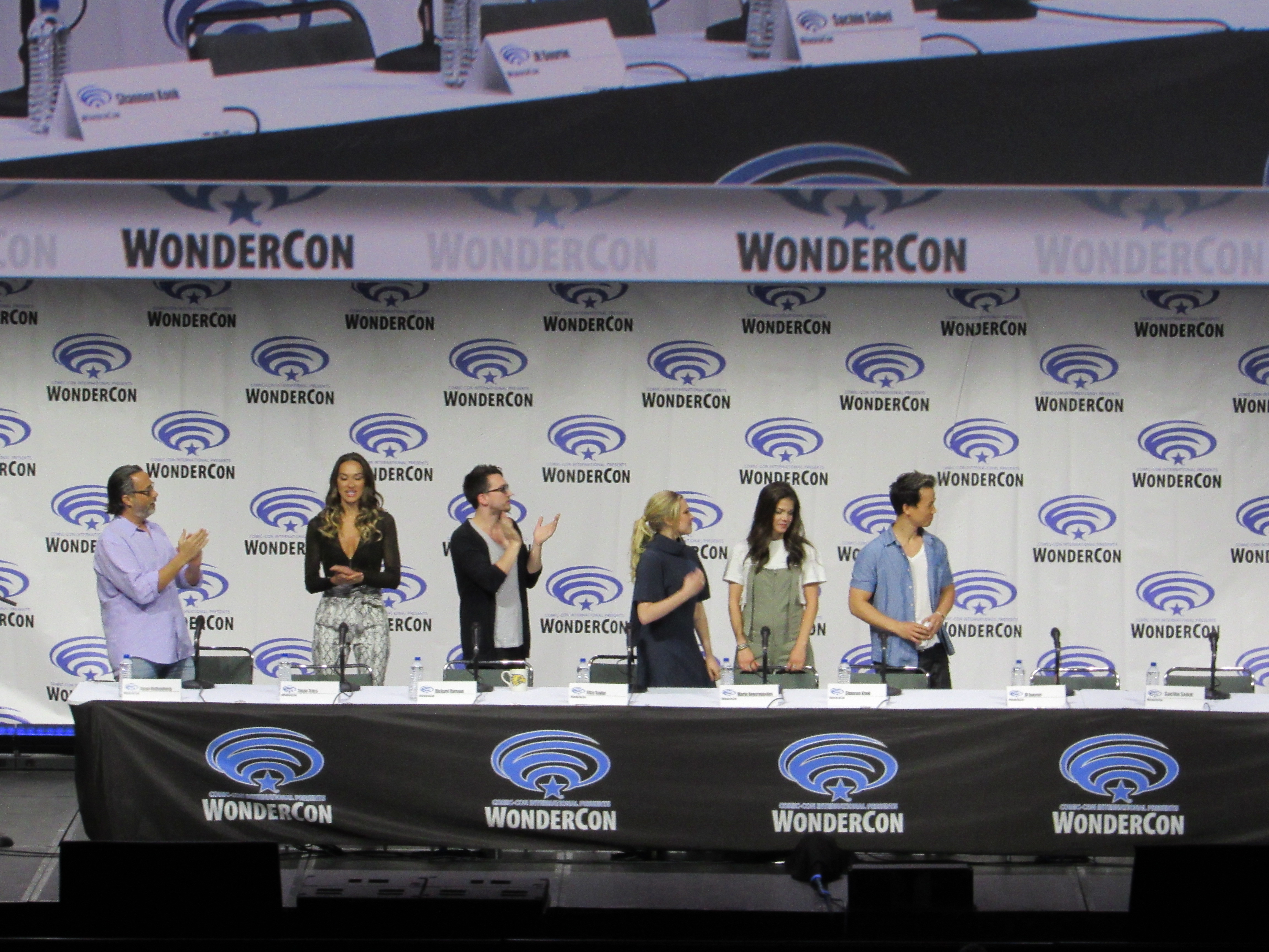 After the episode, the panelists came out on stage, which included showrunner Jason Rothenberg and actors Tasya Teles (Echo), Richard Harmon (Murphy), Eliza Taylor (Clarke), Marie Avgeropoulos (Octavia), Shannon Kook (Jordan), JR Bourne (Russell), and Sachin Sahel (Jackson). Bob Morley (Bellamy) had been originally scheduled to attend the panel, but apparently couldn’t make it, so Sachin, who hadn’t been scheduled to attend, took his place. Bob Morley’s absence was a bit of a disappointment for me, as last year Eliza Taylor hadn’t been able to make it to the WonderCon panel, and I haven’t seen the two of them together on a panel since WonderCon 2016!